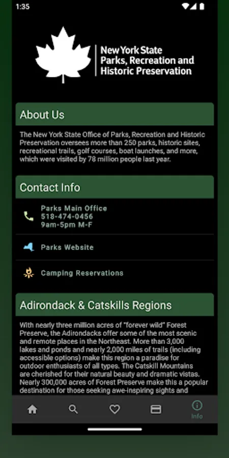 • Users can discover new must-see locations with rotating curated content, and will enjoy quick access to park information, including directions, hours, fees and rates, trail maps, and helpful know-before-you-go details;