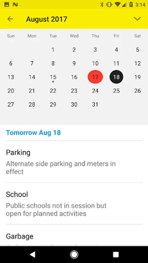 • Stay in the know. Daily status of Alternate Side Parking, trash collection, and schools is always just one tap away. You can also sign up to be notified of any updates to the normal schedule and add this year’s Parking Holidays to your mobile calendar.
