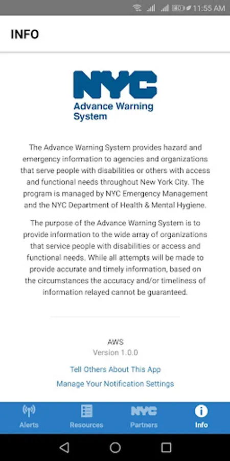 The NYC Advance Warning System alerts organizations that serve people with disabilities and others with access and functional needs to various types of hazards and emergencies in New York City. Participating organizations receive public preparedness and emergency information via e-mail or text messages. Organizations can then act upon this information in the way that best suits their clients.