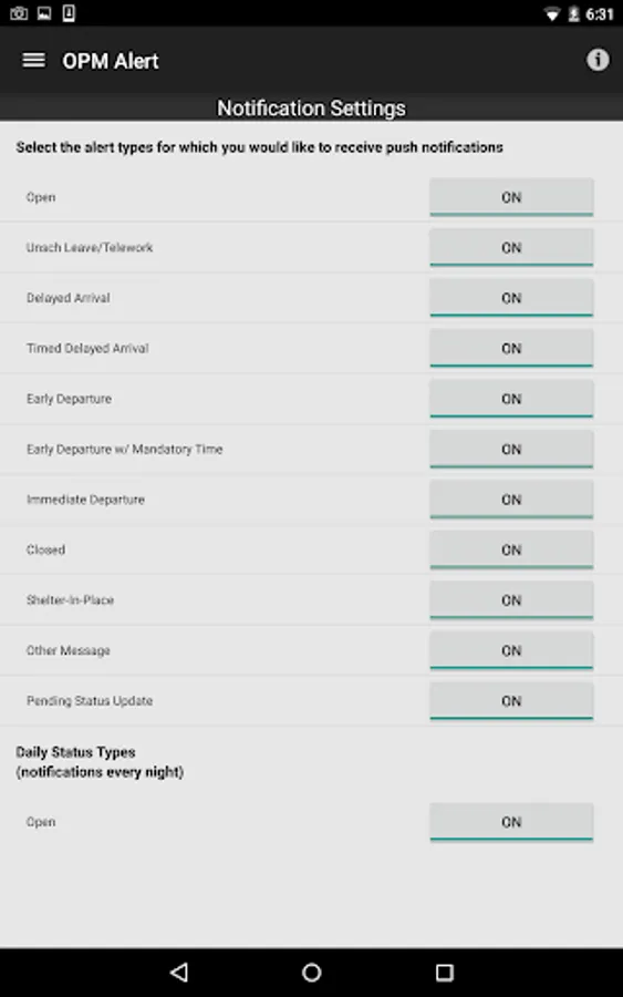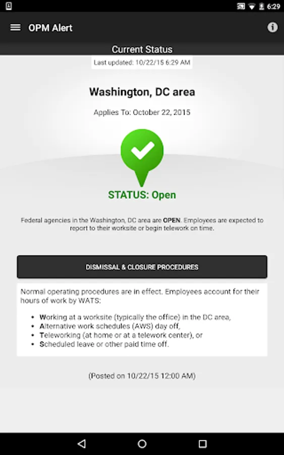 OPM Alert is the official operating status app of the US Office of Personnel Management (OPM). This free app provides a real time look at the current operating status for Federal Government offices in the Washington, DC area.