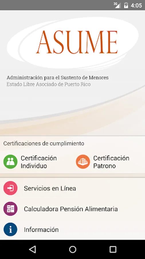 Exercising your responsibility to support your sons and daughters is at your fingertips. ASUME created this application so that you can quickly and easily access information about your food case at the agency from your mobile device. From this app, if you have a case at the agency, you can: create your profile in online services, obtain information about balances and payments, pay alimony by credit card, receive alerts. Participants, citizens and employers can obtain a certification of compliance.