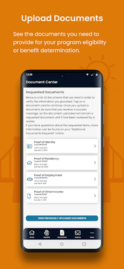 SUBMIT DOCUMENTS See the documents you need to provide for your program eligibility or benefit determination. You can upload documents using your phone’s camera, photo gallery, or a PDF.