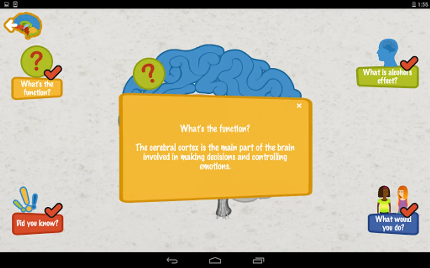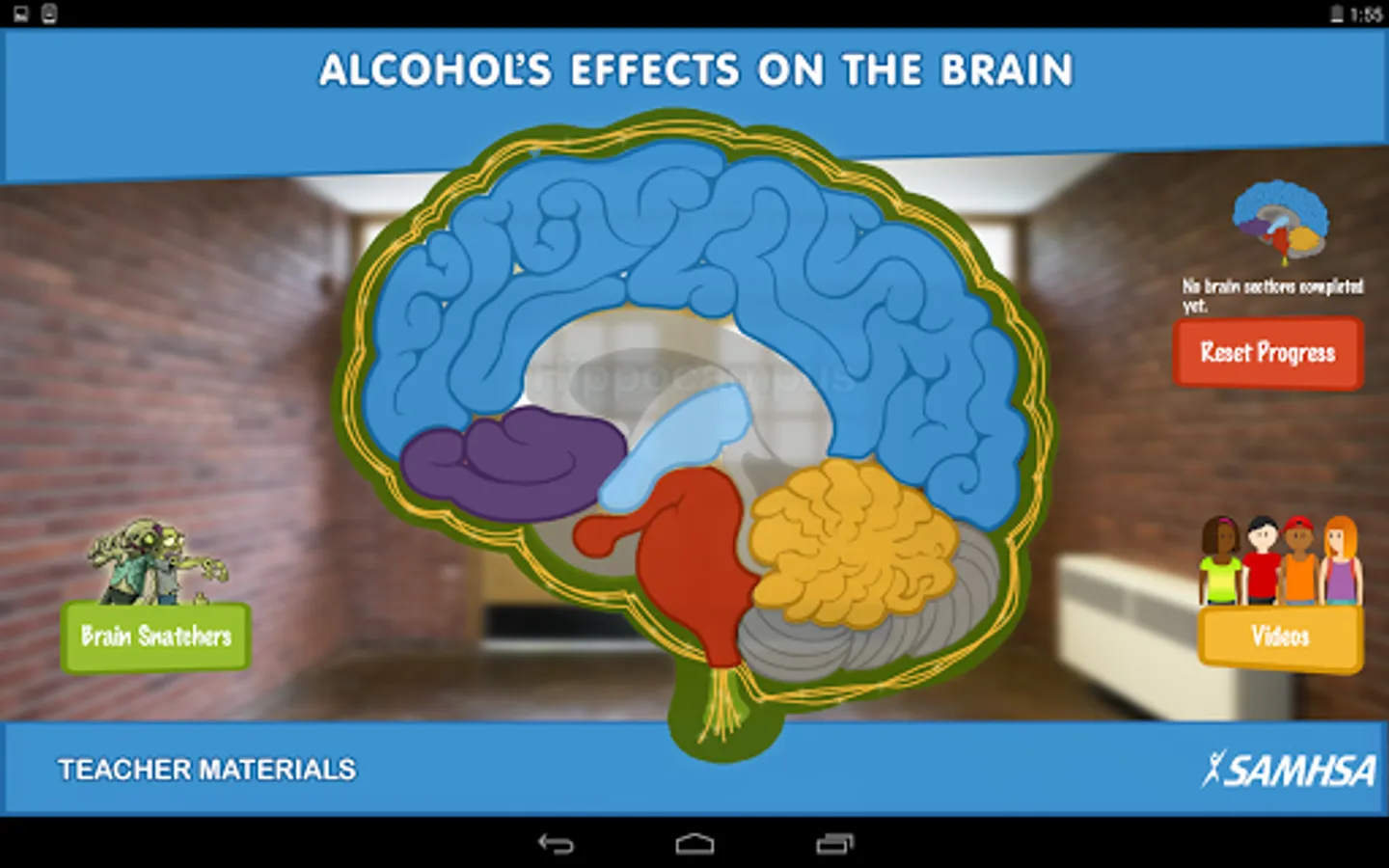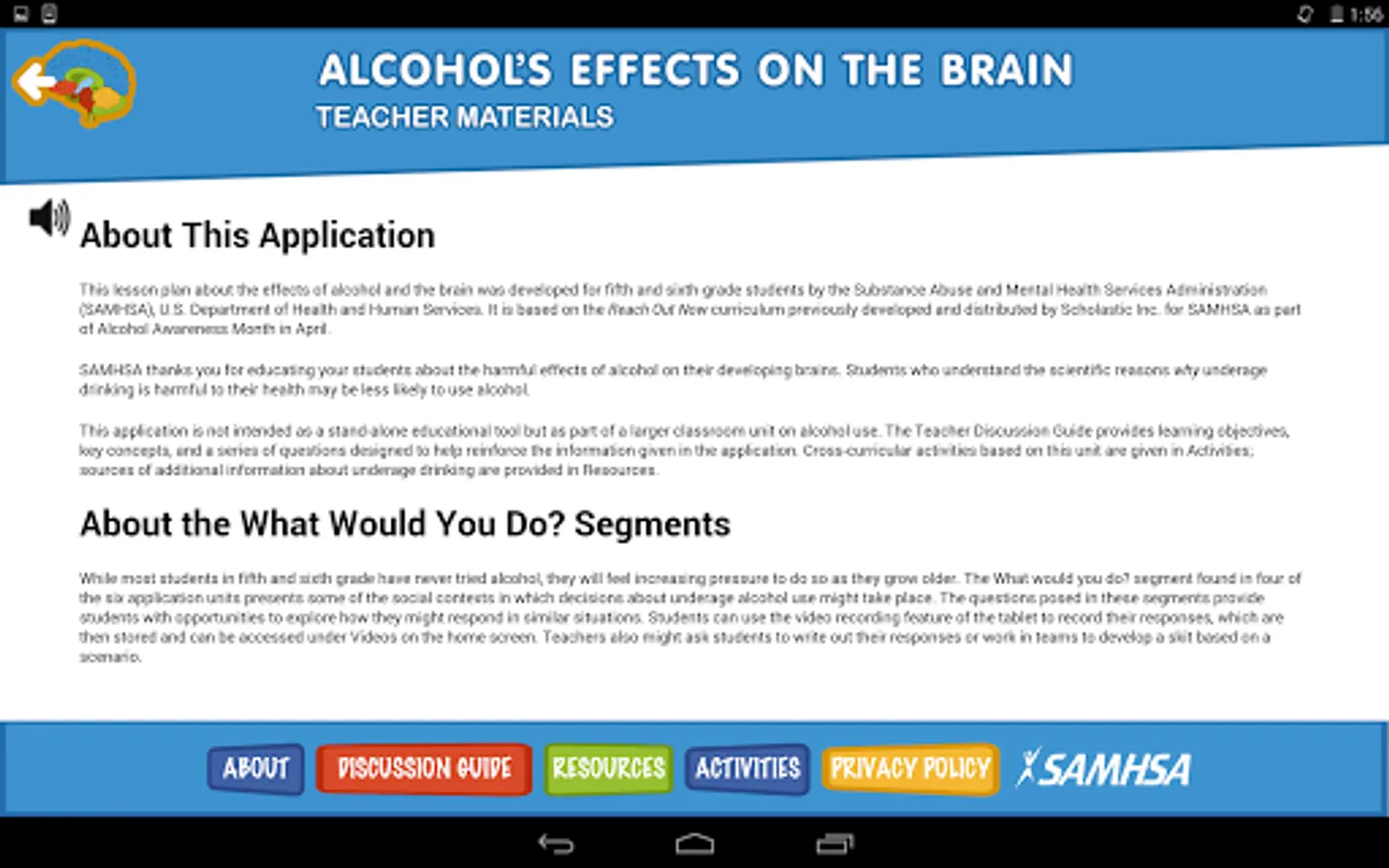 Alcohol’s Effects on the Brain: A Reach Out Now Mobile Application is a science-based curriculum for fifth- and sixth-grade classroom use. Developed by the Substance Abuse and Mental Health Services Administration, this interactive mobile application is divided into six units. Each unit describes the function of one of six parts of the brain and ways in which alcohol use can disrupt this function. Each unit also provides facts related to underage alcohol use that will be of interest to this age group.