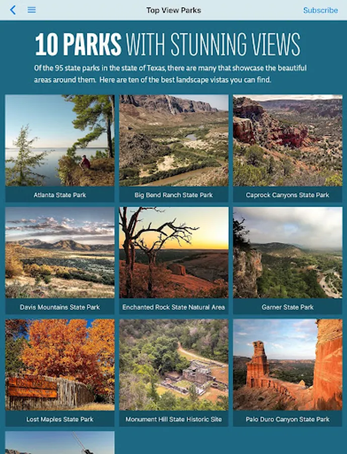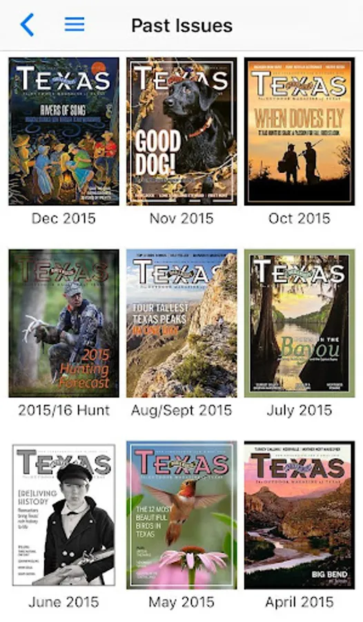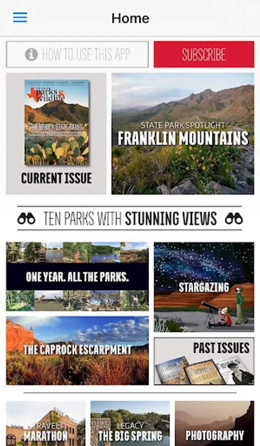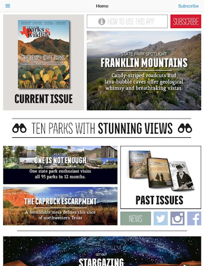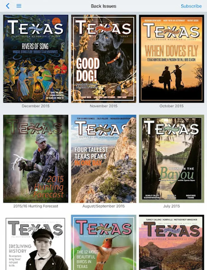 Mobile app with free bonus materials. The app is compatible with Android mobile devices and is designed uniquely for phones and tablets. Experience Texas Parks & Wildlife, the award-winning monthly guide to the Texas outdoors packed with outstanding photos and articles about fishing, hunting, camping, birding, boating, traveling and more. Texas Parks & Wildlife brings you information about state parks, environmental issues and events taking places across Texas as we fulfill our mission—to manage and conserve the natural and cultural resources of Texas and to provide hunting, fishing and outdoor recreation opportunities for the use and enjoyment of present and future generations.