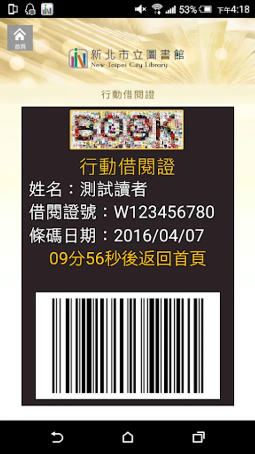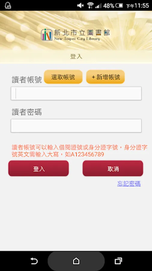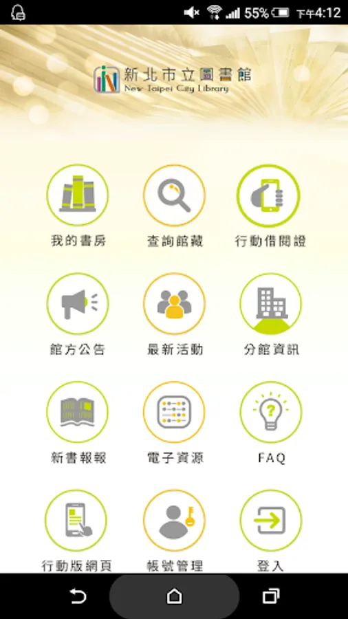 ※New Taipei City Library 108.11.7 Due to damage to the electrical equipment of the main library, library system services (including APP services) are currently suspended. Sorry for the inconvenience