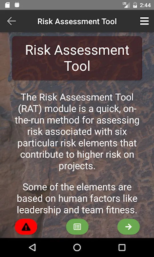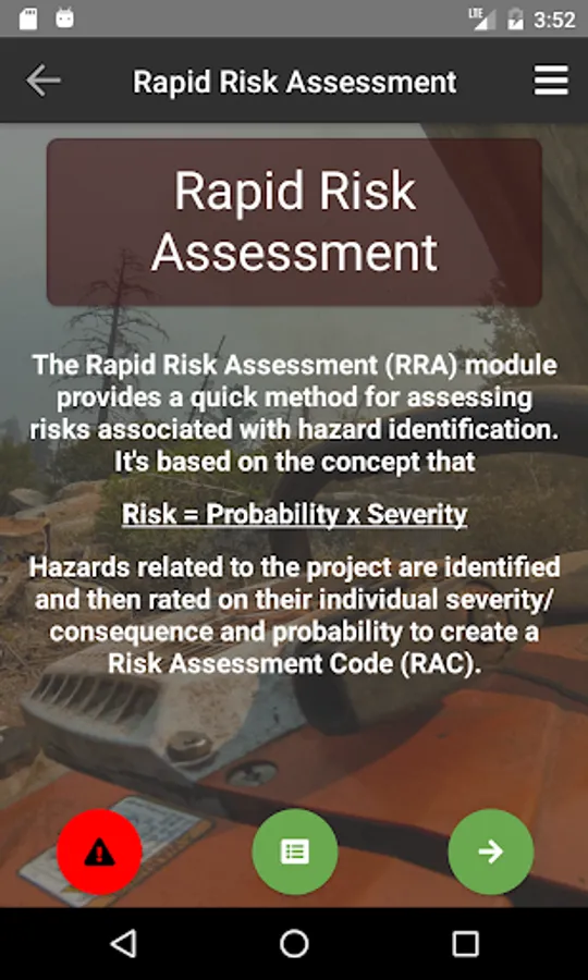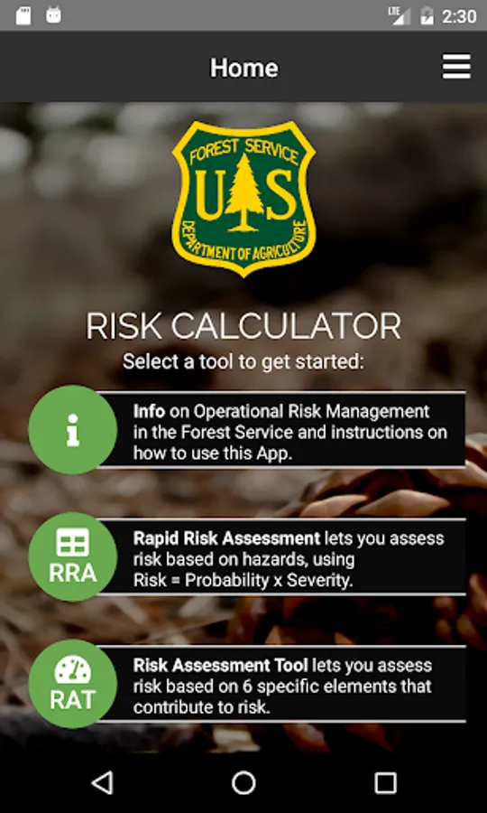 To accomplish the mission of the U.S. Department of Agriculture Forest Service, we expose employees, volunteers, and contractors to a wide variety of environments ranging from secure office settings to extremes of weather, terrain, fires, and floods. All of these workplace situations have hazards that present some degree of risk of harm to employees. Fortunately, most of the risk our employees face is manageable through deliberate, collaborative, and thoughtful risk management. This App exists to help employees expose risks, evaluate how to mitigate them to the lowest practicable level, and then decide if achieving the objectives is worth accepting the residual risks.
