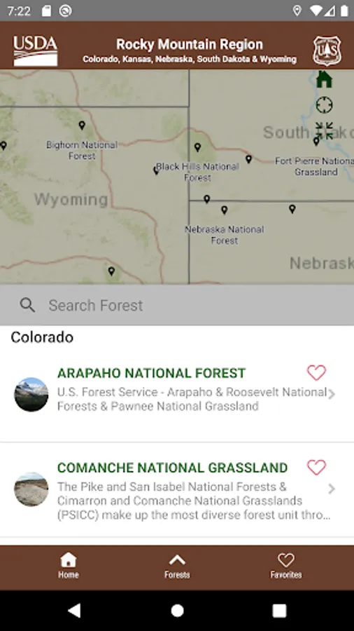 The Rocky Mountain Region’s 17 national forests and 7 national grasslands units in this app include: