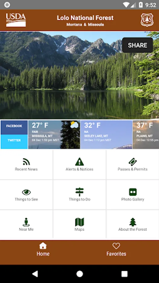 This mobile app gives you access while online to the Lolo National Forest recreational opportunities, public notices, news, alerts, and more. The Lolo National Forest is located in western Montana, headquartered out of Missoula, and covers over 2 million acres of scenic public land, ready for you to explore! With campgrounds, picnic areas, lakes and rivers, trails for hiking, horseback riding, bicycling and OHVs, scenic mountain roads, rustic cabins and lookouts to rent, and so much more, you are guaranteed to find the perfect activity! In the winter explore our extensive cross-country and downhill skiing opportunities, go snowboarding or snowmobiling, or get off the beaten path for a quiet snowshoe adventure. Here are just some ways of using this app to ensure you're taking advantage of all the great tools and information available: