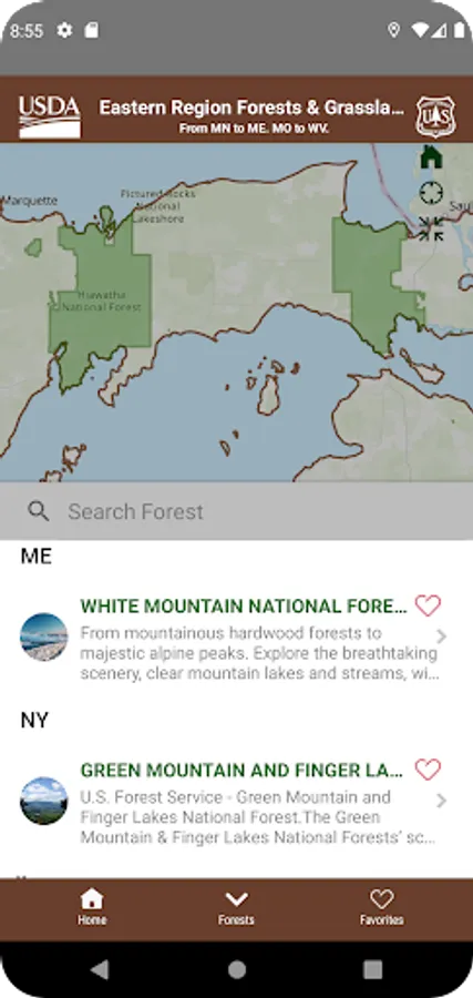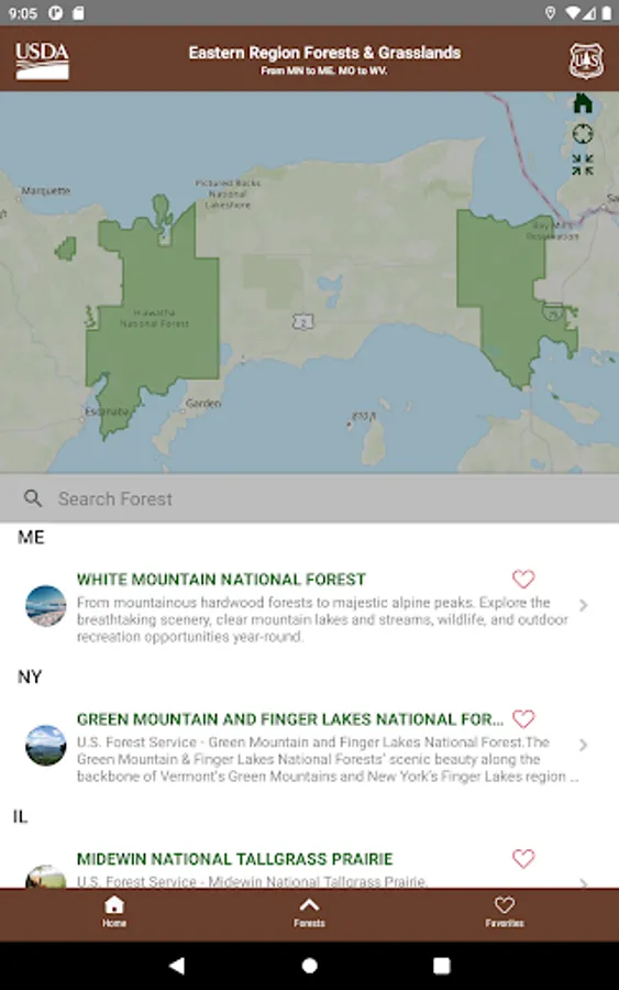 The official Eastern Region National Forest app provides essential information about the National Forests from Minnesota to Maine, and from Missouri to West Virginia. This app includes information on recreational activities and sites, trail permit information, alerts, maps, news, events, directions and contact information. Plan and prepare your visit to the Forest with the many great tools and features such as “Things to Know”, “Things to See”, “Things to Do” and “Near Me”.