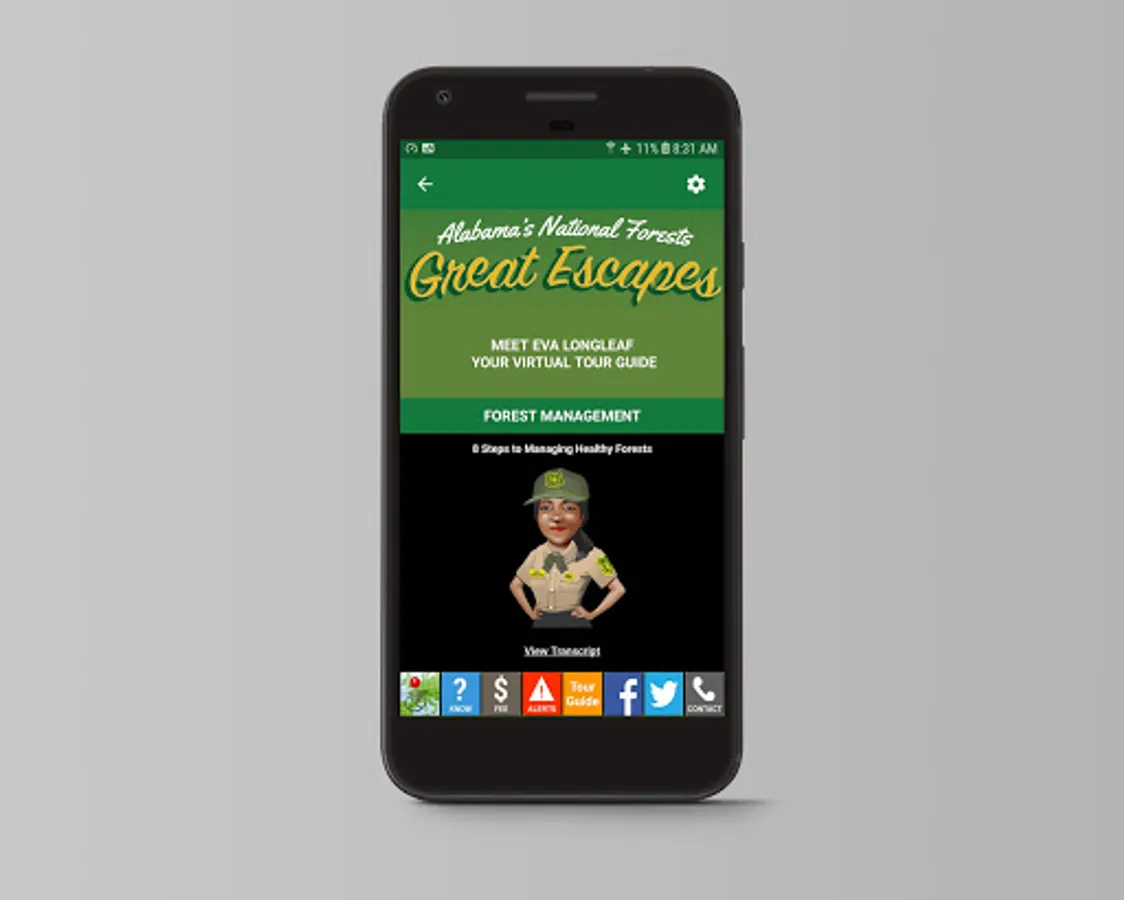 Forest visitors downloading the new Forest Service mobile app will be welcomed by “Eva Longleaf” a Forest Service virtual tour guide providing information on recreation activities, national forest history and what is happening in the natural world surrounding them. Eva Longleaf will explain how national forests are working forests where you can expect to see controlled burns, tree thinning, tree planting and other management activities throughout the year. The projects are focused on maintaining the health and resilience of national forests while at the same time providing products and services to the public. Visitors will also learn about the history of each national forest in Alabama. Eva Longleaf communicates (one-way) with visitors to assist them in planning activities while on the Bankhead, Talladega, Conecuh and Tuskegee National Forest. For 508 compliance, a script is provided for visitors on the mobile app.