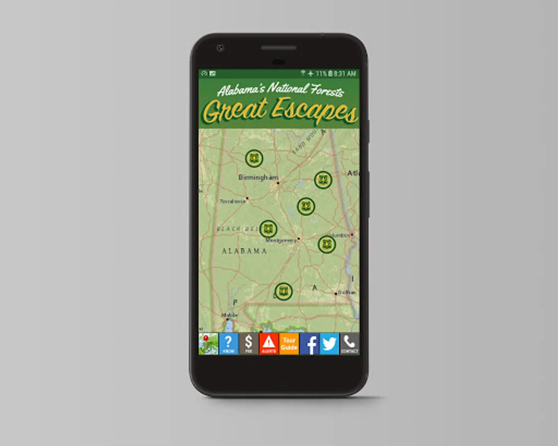 The mobile device application is for outdoor enthusiasts interested in planning trips to Alabama’s four national forests –Bankhead, Talladega, Conecuh and Tuskegee. Using a blend of website and native app capabilities, Alabama “Great Escapes” mobile app provides the following essential information:
