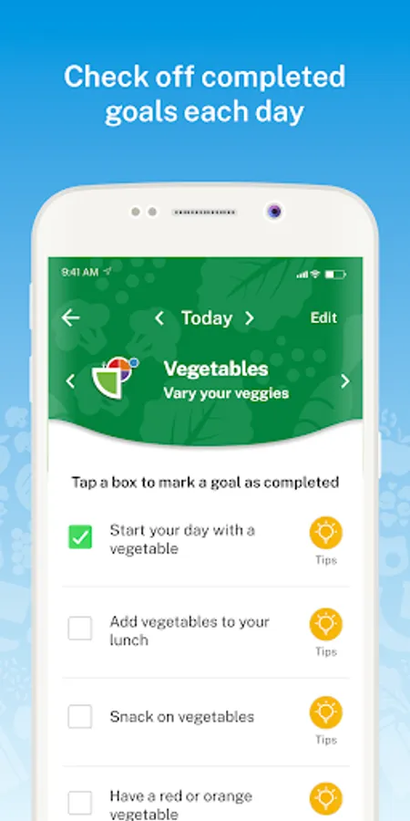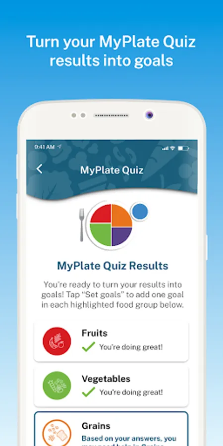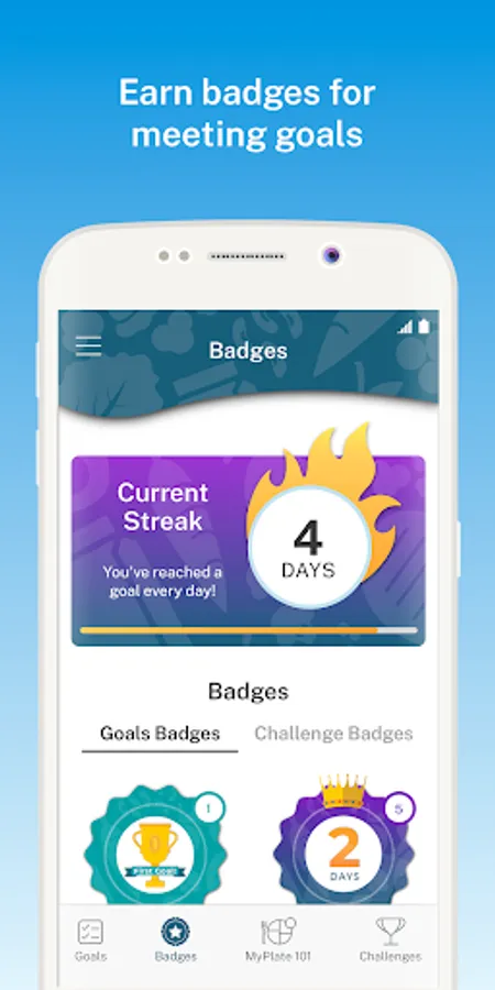 - Collect a variety of badges such as first goal complete, daily-streaks, food group badges, and the ultimate MyPlate badge