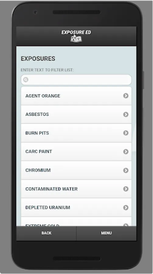 Exposures Education Mobile Application provides Department of Veterans Affairs (VA) and non-VA healthcare providers with access to environmental exposures information and resources through the use of mobile technology. It will give providers/ Veterans “just-in-time” information and will serve as a centralized, easy-to-access location for providers/Veterans in finding comprehensive environmental exposure information, referrals, and training, all in a standardized format. The app will also help with earlier identification and awareness of conditions after exposure to environmental hazards that can affect the health of Veterans