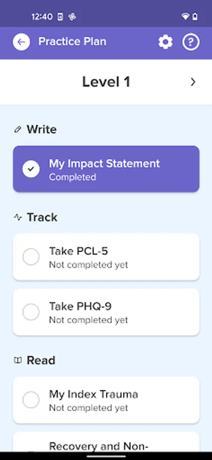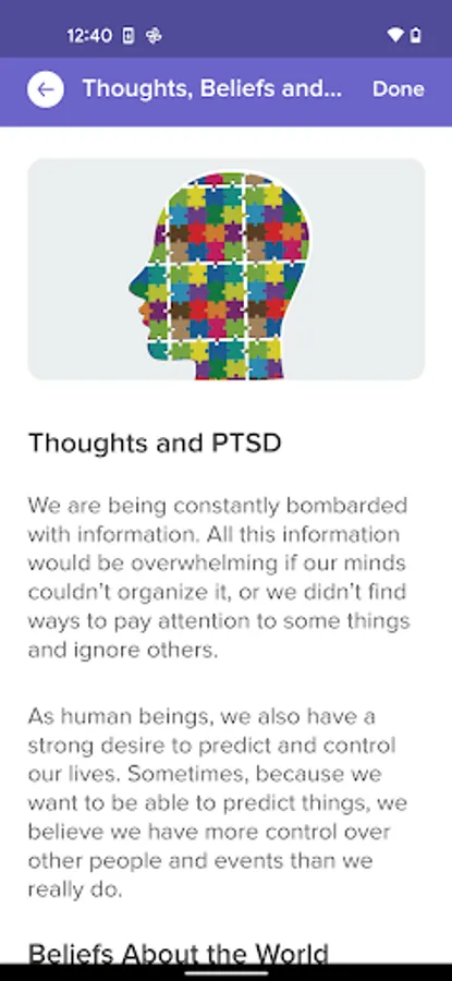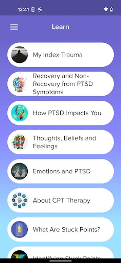 CPT Coach is for people who are participating in Cognitive Processing Therapy (CPT) with a professional mental healthcare provider. This app contains support materials for a complete course of CPT to help patients manage their treatment, including between session assignments, mobile versions of CPT worksheets, readings, and PTSD symptom monitoring.