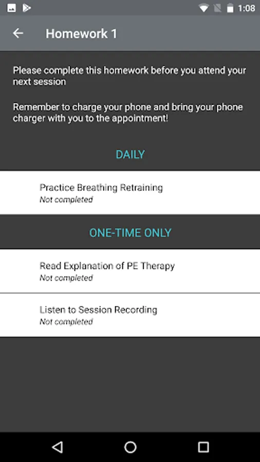 PE Coach is designed to be used during therapy for posttraumatic stress disorder (PTSD) with a health professional who is trained in Prolonged Exposure (PE) therapy. The app will guide you through the exercises assigned by your therapist and allows you to track and record your progress. In addition, the app provides techniques such as controlled breathing that will help you tolerate and decrease your distress. PE Coach will help you remember and track your upcoming therapy sessions. You will be able to audio record your sessions directly onto your phone so you can review them later as part of your treatment.