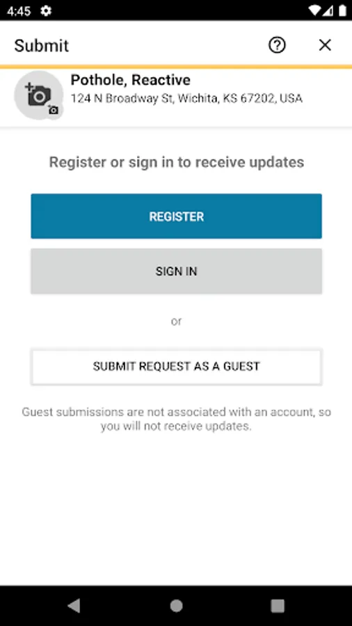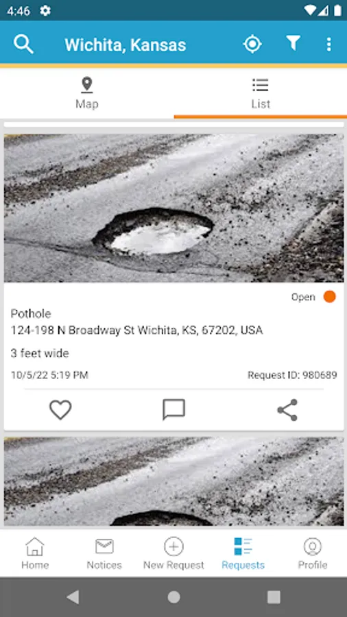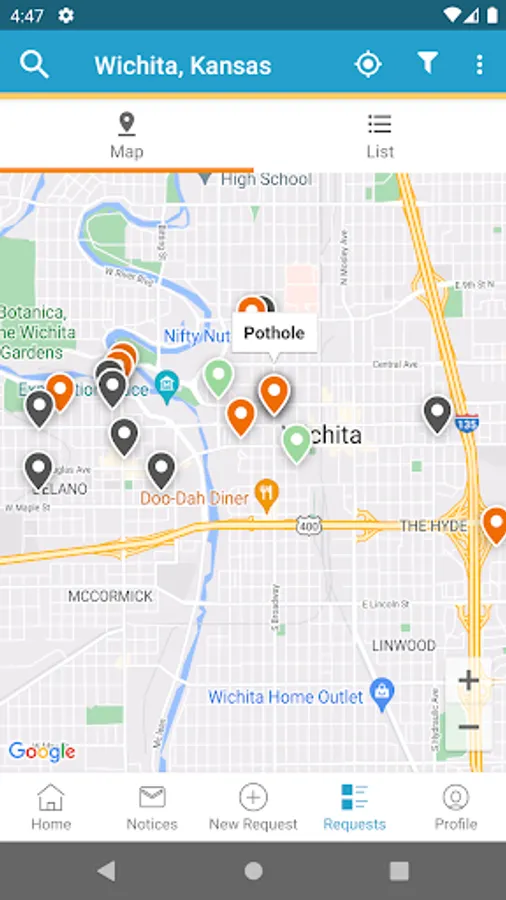 Report issues such as potholes, graffiti, illegal dumping and more to the City of Wichita. You are also able to create an account and track progress of your submissions.