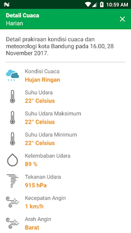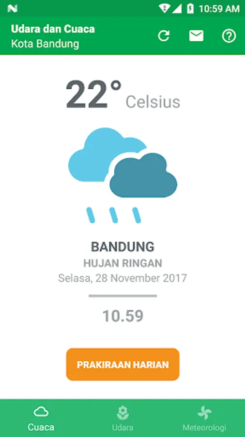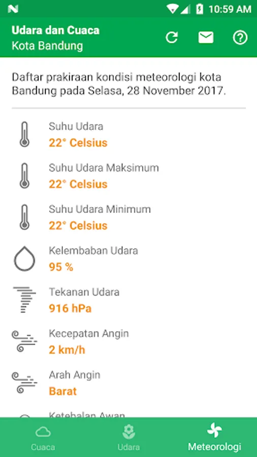 Air and Weather app Bandung is an application that displays air quality conditions based air pollution index (ISPU), latest weather forecast, weather forecasts for the next five days, and forecast meteorological conditions, to the city of Bandung.