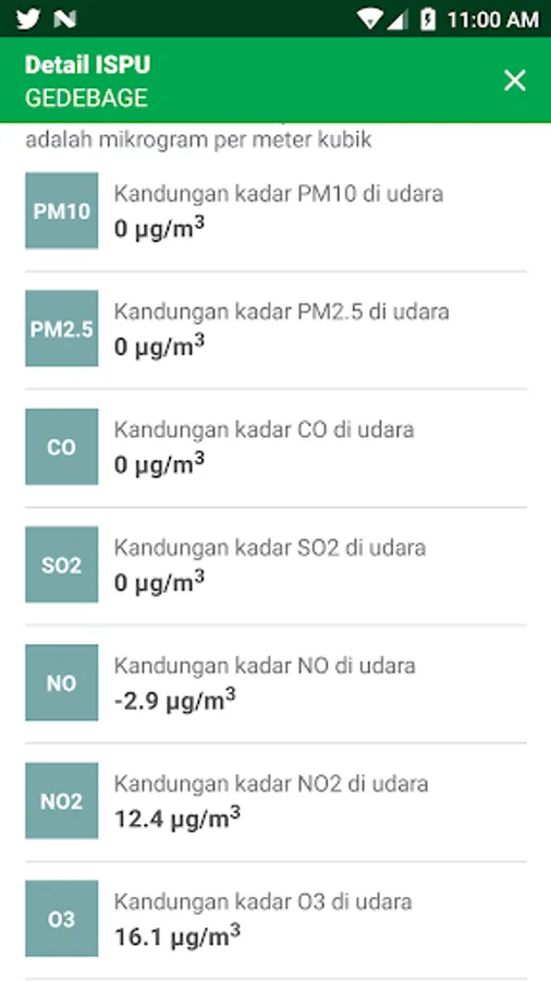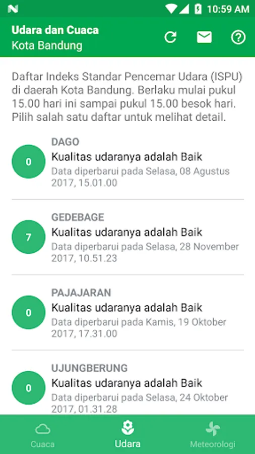 Within this application, there is a list of the value of air pollution index (ISPU) which bersumberkan of air quality monitoring sensors belonging to the Department of Environment and Hygiene Bandung. With the sensor monitors air quality in the area Gedebage, Padjadjaran, Edge Berung, and Dago.