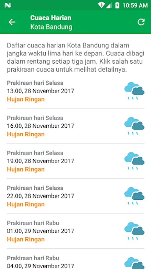 In addition this application also displays the weather forecasts and current meteorology to Bandung. Bandung as well as weather forecasts in the intervening three hours ahead to five days to come. Keep in mind that the weather can change quickly at any time, so the forecast can not be in accordance with the weather conditions sesungghuhnya.