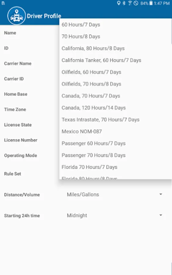 Compliant app to record driver duty status and meet the following US and Mexico regulations: