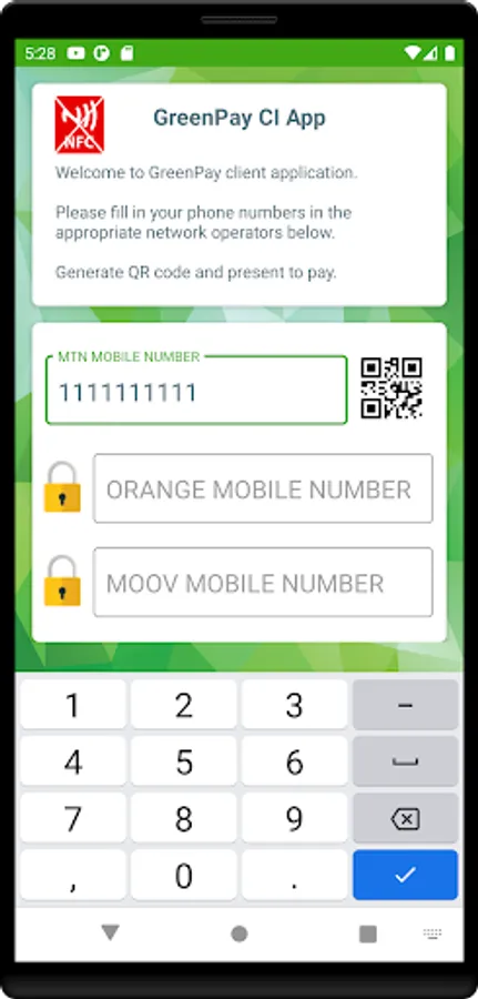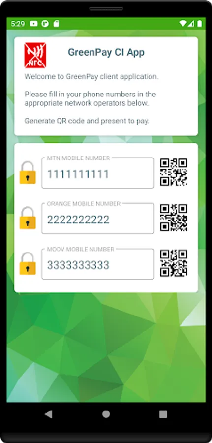 Cette application permet aux abonnés MTN Mobile Money et Orange Mobile Money de payer par NFC et par QR code dans les points de vente équipés d'un terminal GreenPay. Le paiement NFC et QR code permet non seulement de garder la confidentialité du numéro de téléphone mais aussi évite toute erreur possible due à la saisie manuelle.