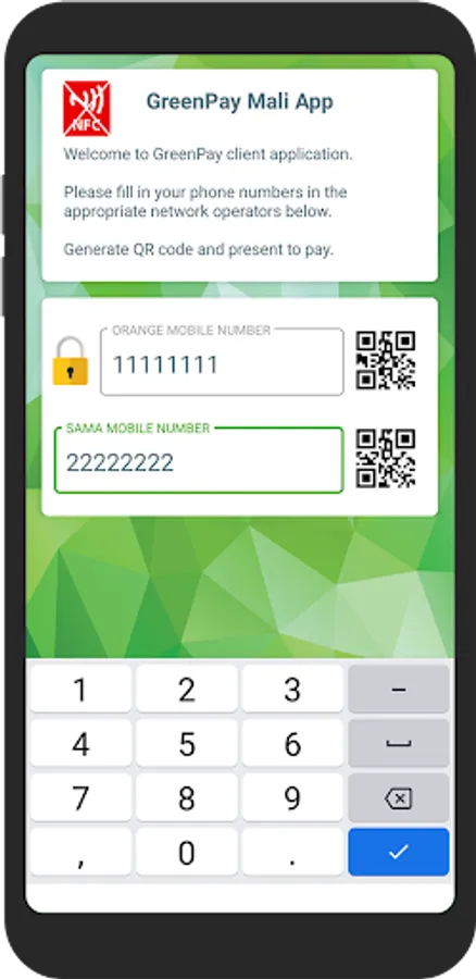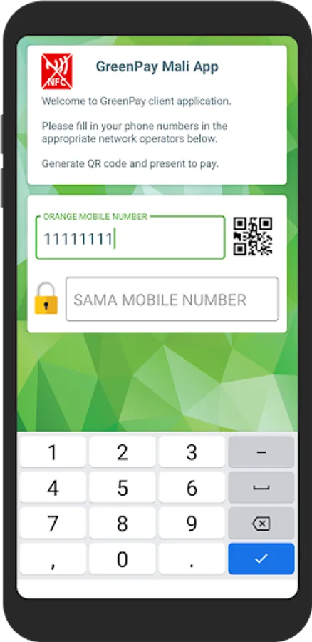 Cette application permet aux abonnés Orange Mobile Money de payer par NFC et par QR code dans les points de vente équipés d'un terminal GreenPay. Le paiement NFC et QR code permet non seulement de garder la confidentialité du numéro de téléphone mais aussi évite toute erreur possible due à la saisie manuelle.