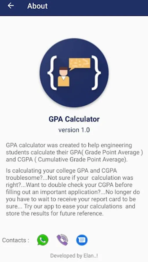 Is calculating your college GPA and CGPA troublesome?ππ...Not sure if your calculation was right?ππ...Want to double check your CGPA before filling out an important application?ππ»ππ»..No longer do you have to wait to receive your report card to be sure... Try our app to ease your calculations and store the results for future reference.ππ