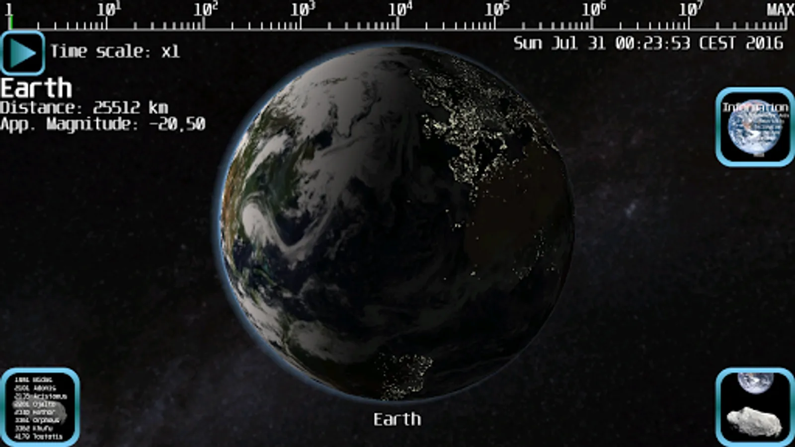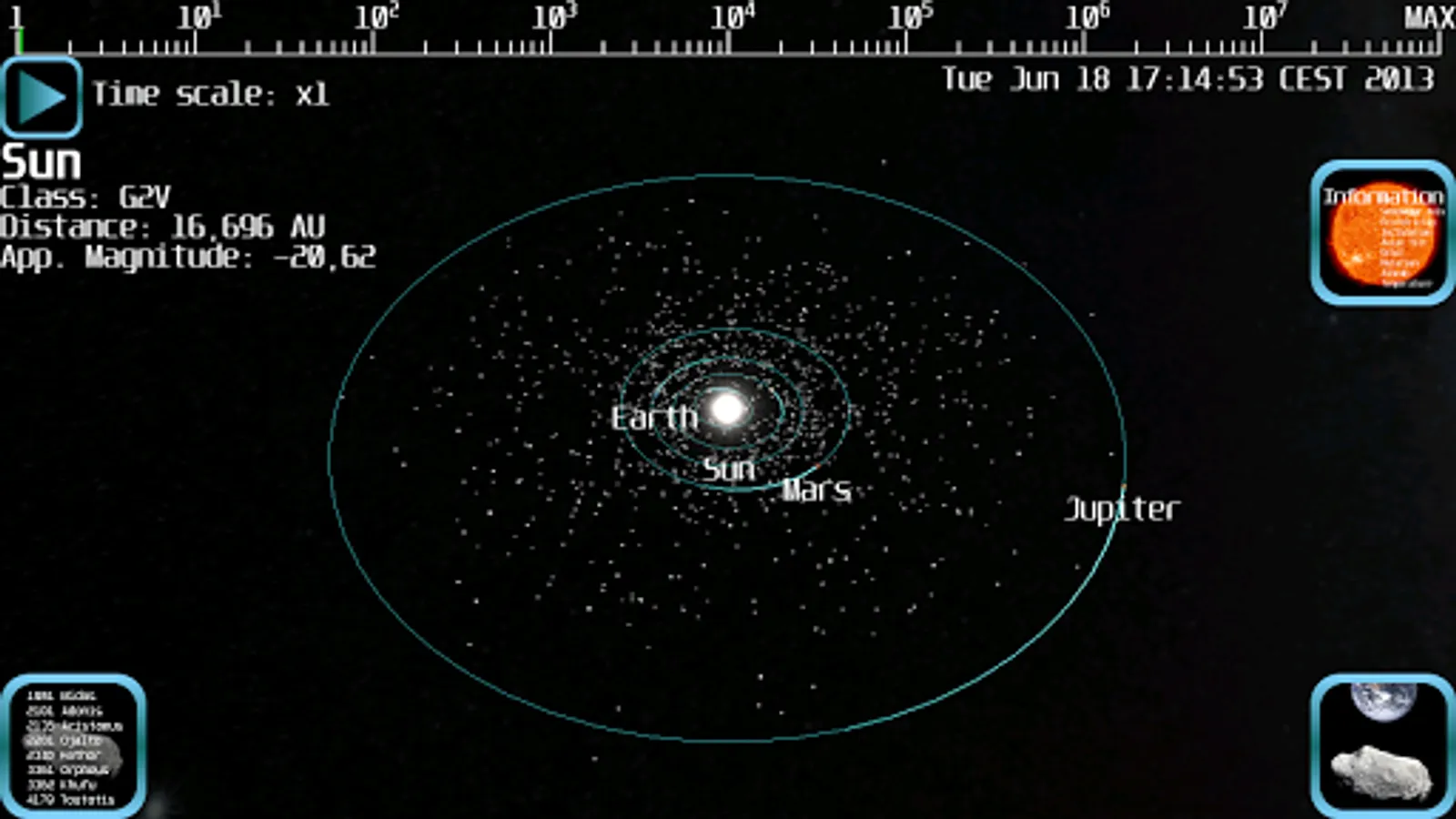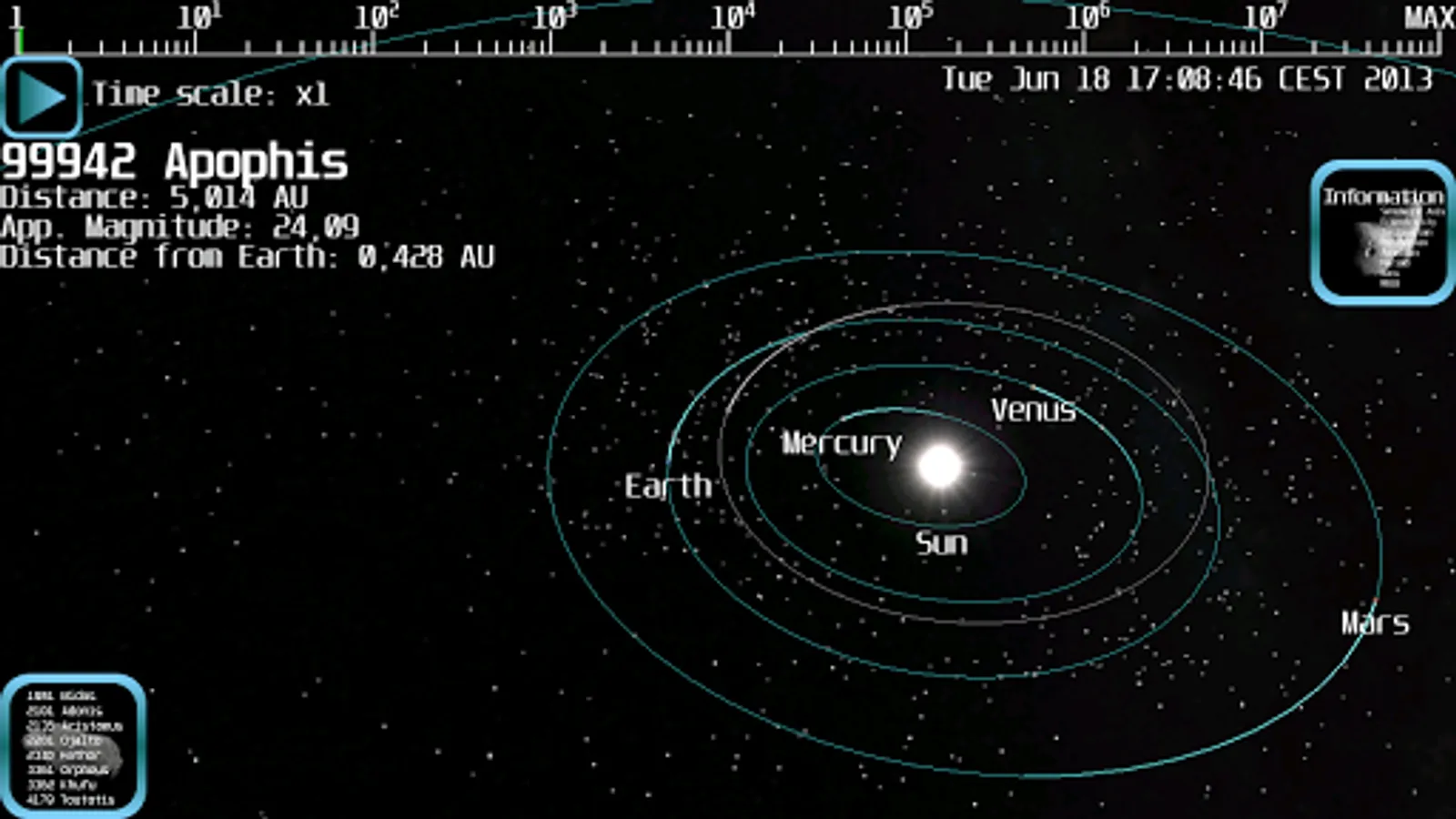 This app simulates the trajectories of nearby asteroids that are potentially dangerous to Earth. You can watch in real time where they are, were, or will be at any given time.