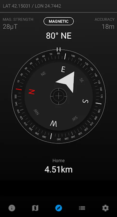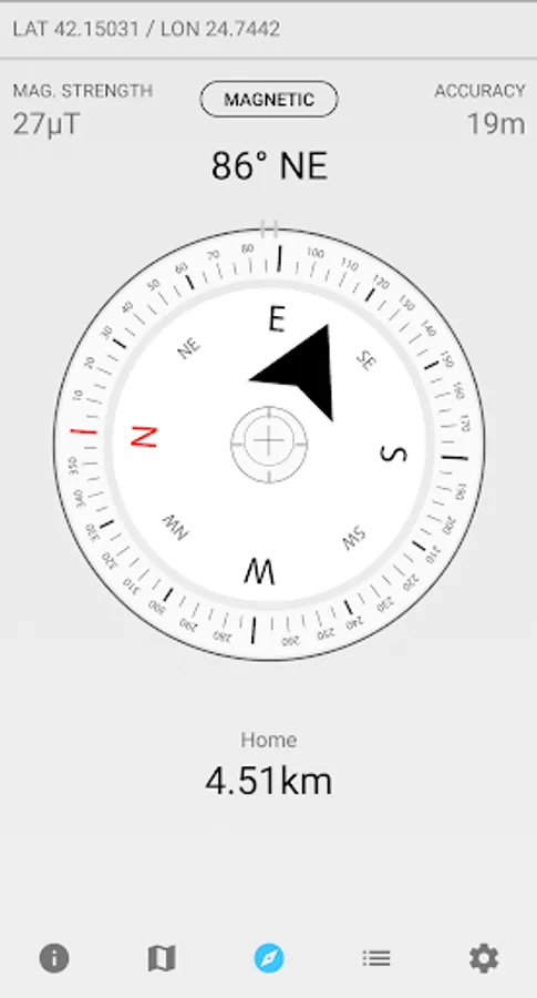 Supports imperial and metric systems, declination correction and coordinates in DMS and MGRS.