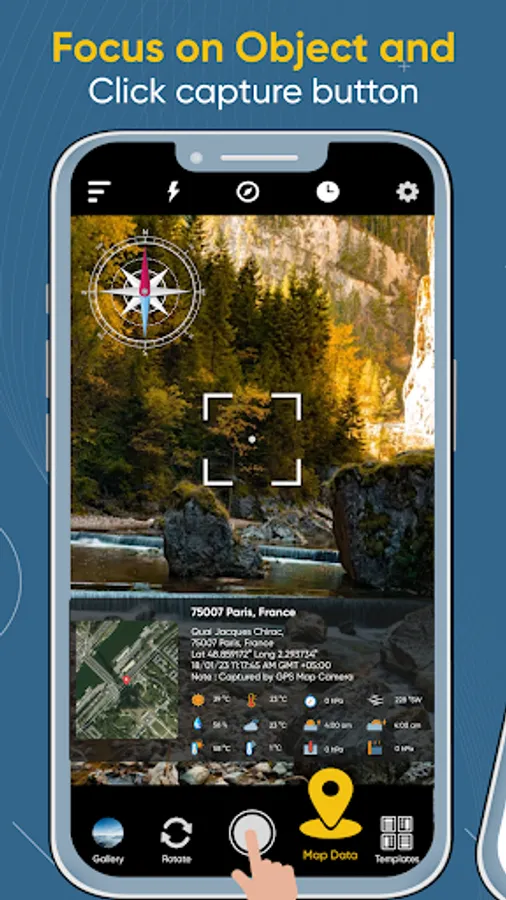 The collection feature of the geo tag / GPS cam allows the user to view all the captured images using the app. In addition, the rotate feature of GPS photo / geo tagged photo permits the user to rotate the camera of the device. Moreover, the capture feature of the geo location / geo camera app lets the user capture the image. Similarly, the map data feature of goetag stamp / GPS with camera authorizes the user to add map data to the image. Finally, the template feature of the GPS map camera / camera with GPS allows the user to select templates to live camera.