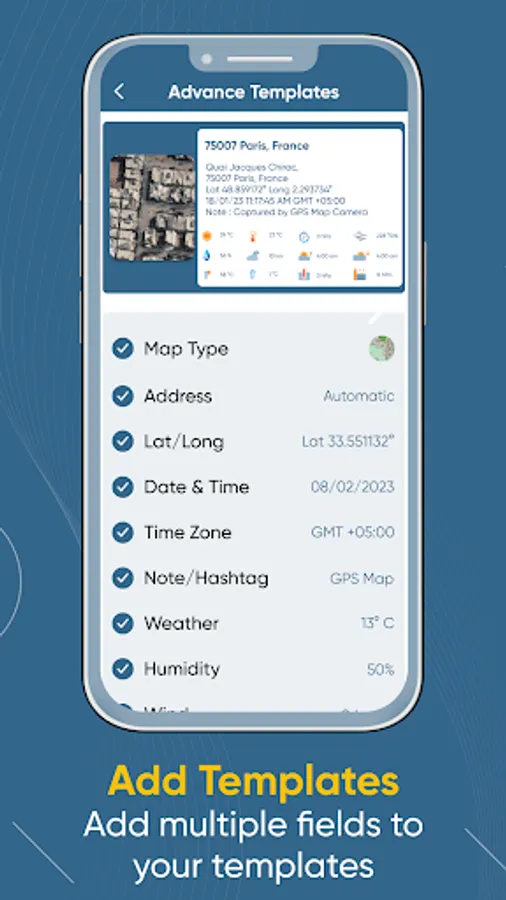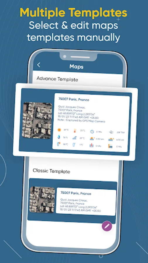 7. The template feature of GPS map camera / photo map allows the user to select templates to live camera. The templates are default and advanced. The default template of gprs app permits the user to add address, location, latitude, longitude, date, and time stamp. Similarly, the advance stamp lets the user add an address, location, latitude, longitude, date and time stamp, temperature, note/hashtag, weather, maximum temperature, minimum temperature, wind, humidity, pressure, sunrise, sun set, sea level, and ground level.