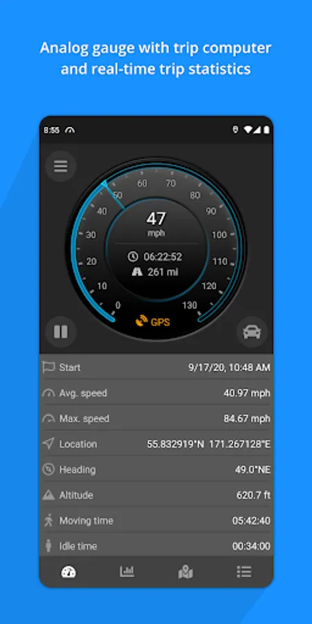 A dashboard with modern, analog speed gauge and trip computer showing current trip data as you drive. Check your average and max speed, current location (GPS coordinates – latitude and longitude), heading, elevation and trip time.