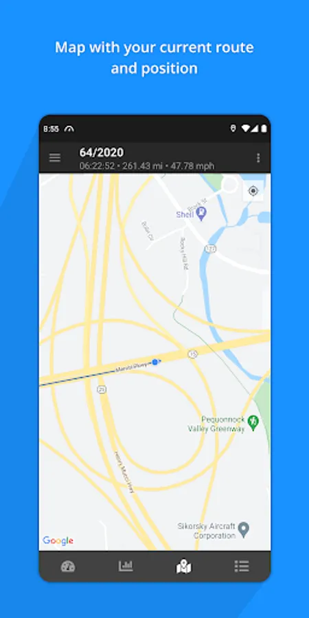 See your route and position on a map with markers indicating particular trip events like trip start, pause, end, GPS signal lost or found.
