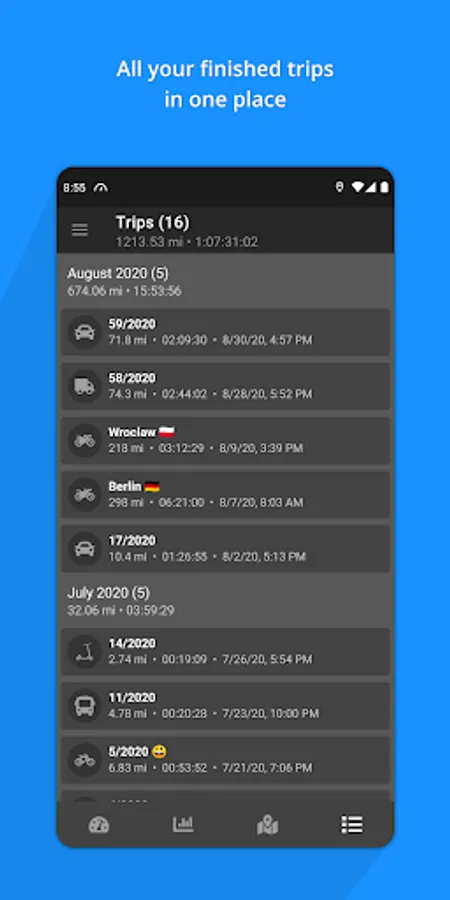 ✓ 20+ trip icons (for drivers, truck drivers, bikes, motorcycles, etc.) to easily categorize all your trips