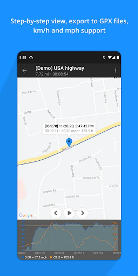 Turn your phone into GPS tracker and get detailed trip statistics with GalileoGPS Speedometer – GPS app for Android that includes: