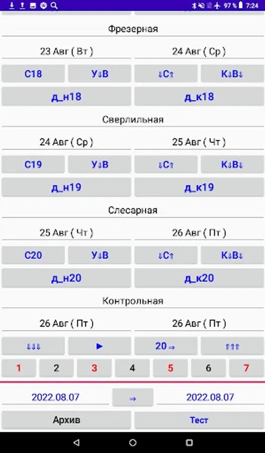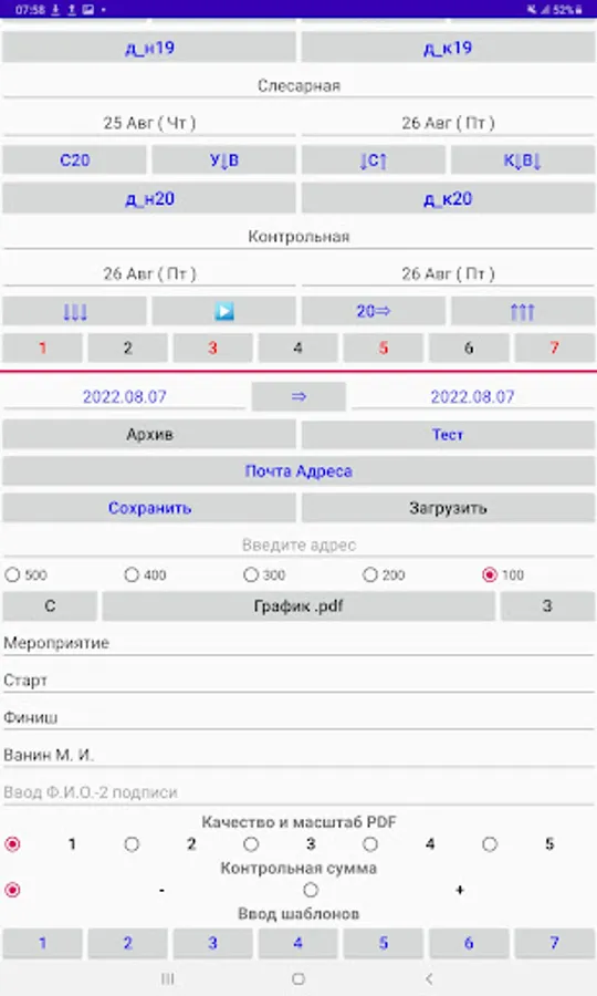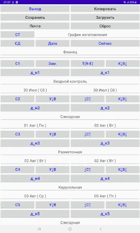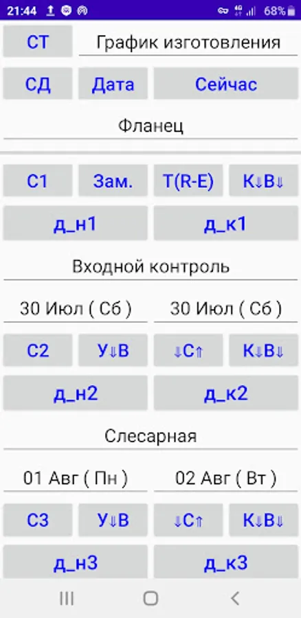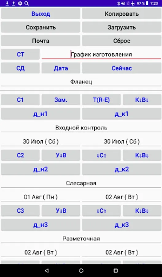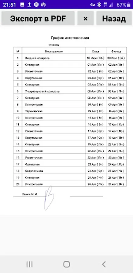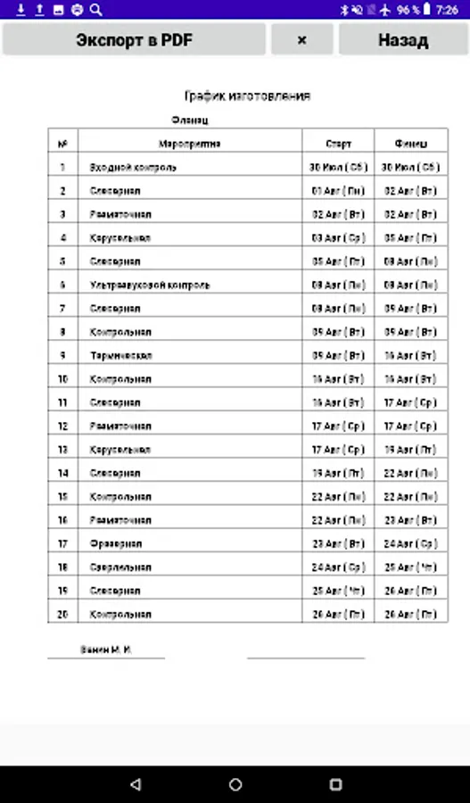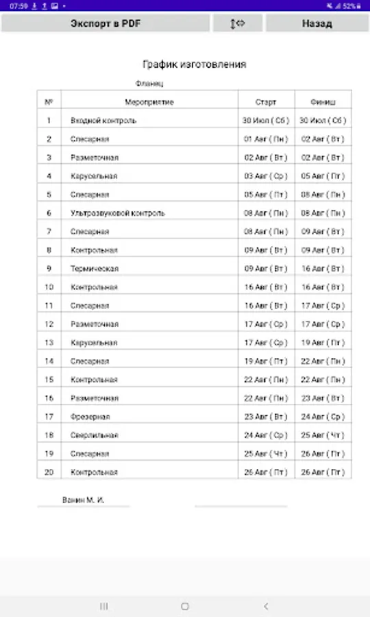 Drawing up a manufacturing schedule (GI) of a part for operations (no more than 20 lines) with setting the start and end dates of the operation and export to a .pdf file.