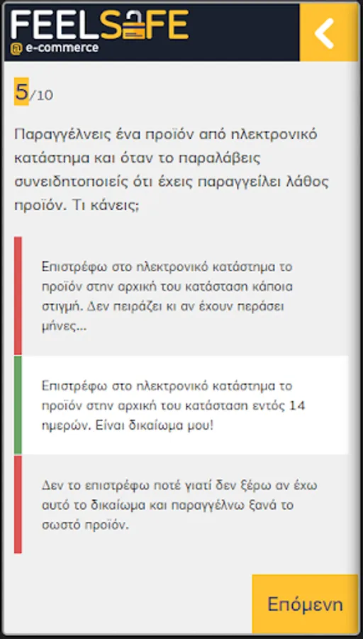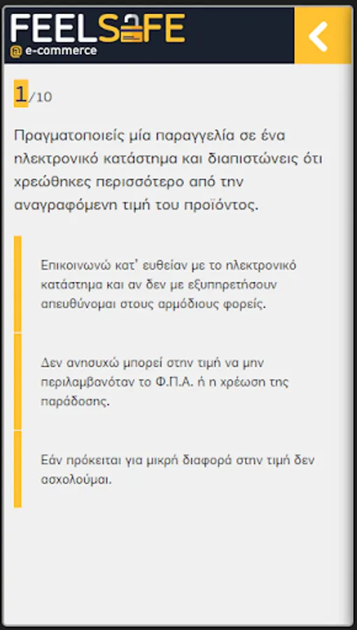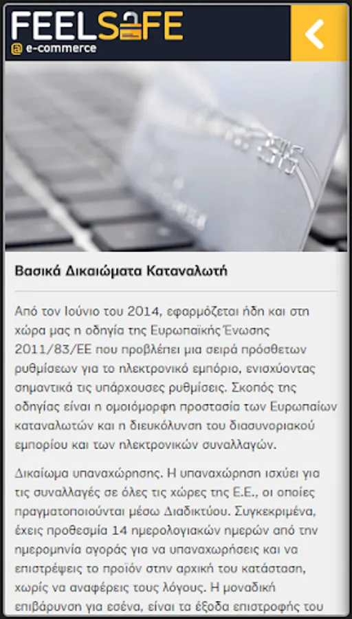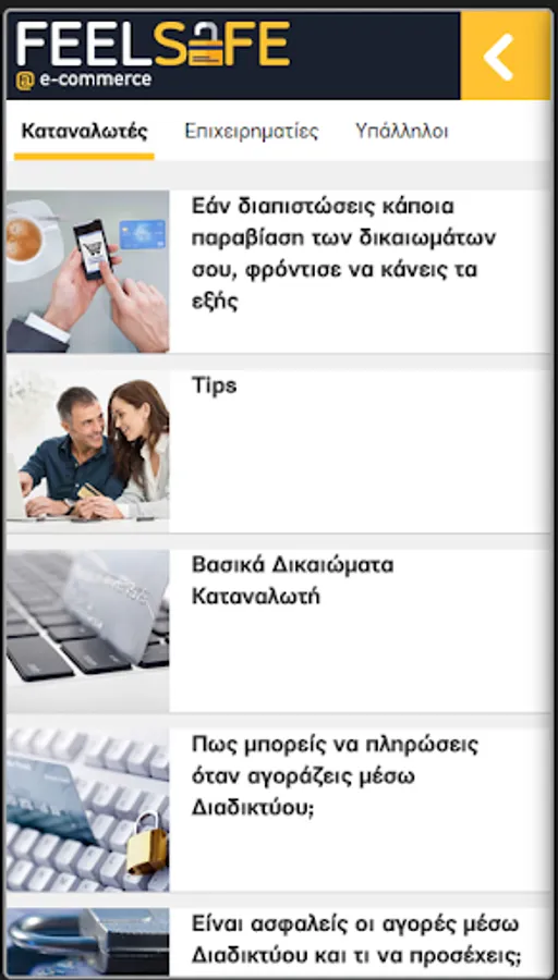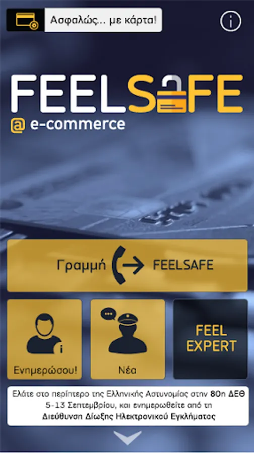 The Department of Electronic Crime and the Greek Confederation of Commerce and Entrepreneurship under the cooperation protocol signed, developed the innovative action entitled «FeelSafe» in e-commerce, aiming the preservation of the commercial and business world of the country and consumers from online fraud phenomena. The application is a key step to inform citizens and business members of the EERA (entrepreneurs and employees in enterprises) on the safe navigation and adapt to electronic commerce and in particular on the use of plastic money.