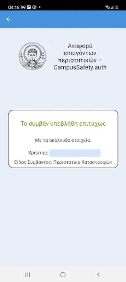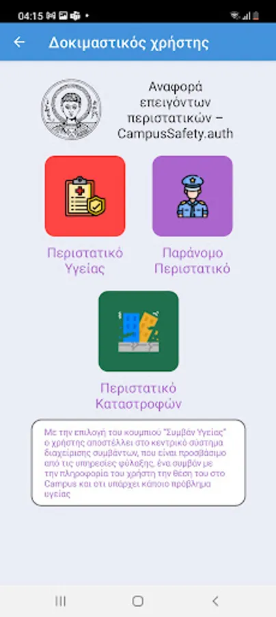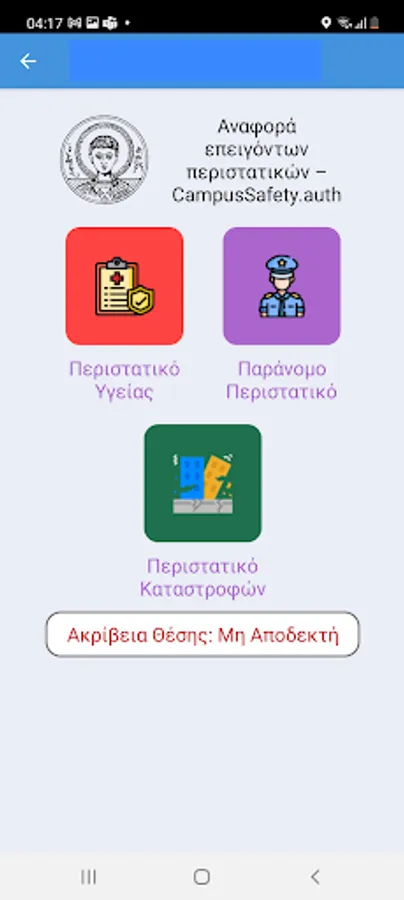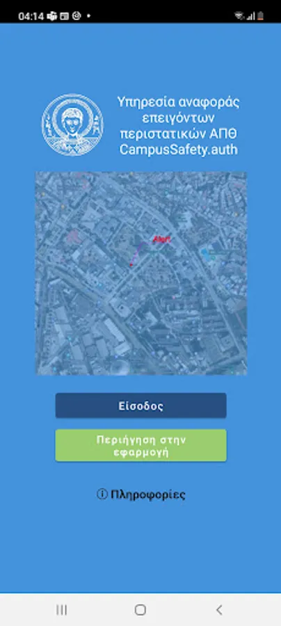 The Campus Safety application is the Emergency Reporting service provided to the AUTh academic community within the campus. The aim of the service is to enable the members of the University Community to be able to immediately notify the Guardian Service of an emergency (illegal activity, health incident, destruction of the material and technical infrastructure of the Institution). The service does not replace the communication with the local emergency services (Police, EKAB, Fire Department) that operate on a 24-hour basis or the European emergency call number "112". It operates in addition to these services so that the Security Service of the Aristotle University of Thessaloniki, which also operates on a 24-hour basis in the Administration Building, receives immediate knowledge and proceeds with the planned actions.
