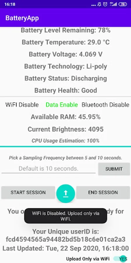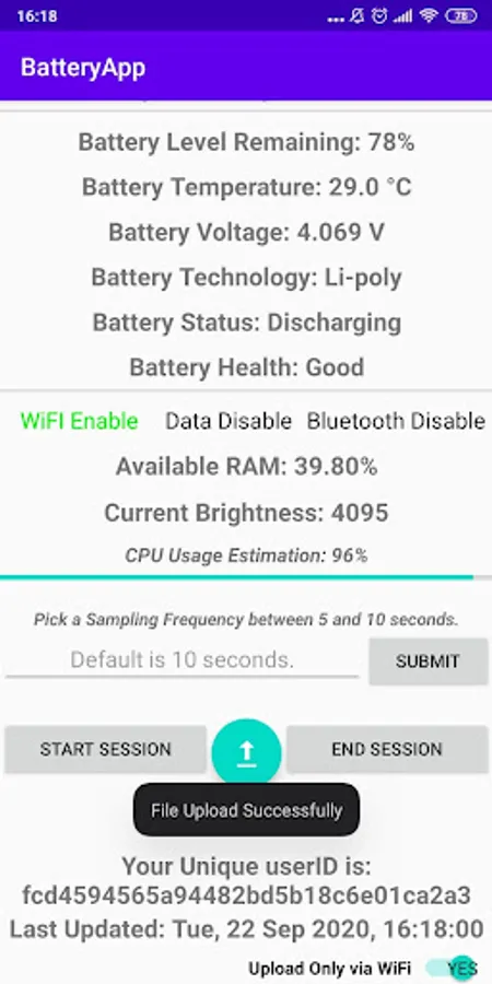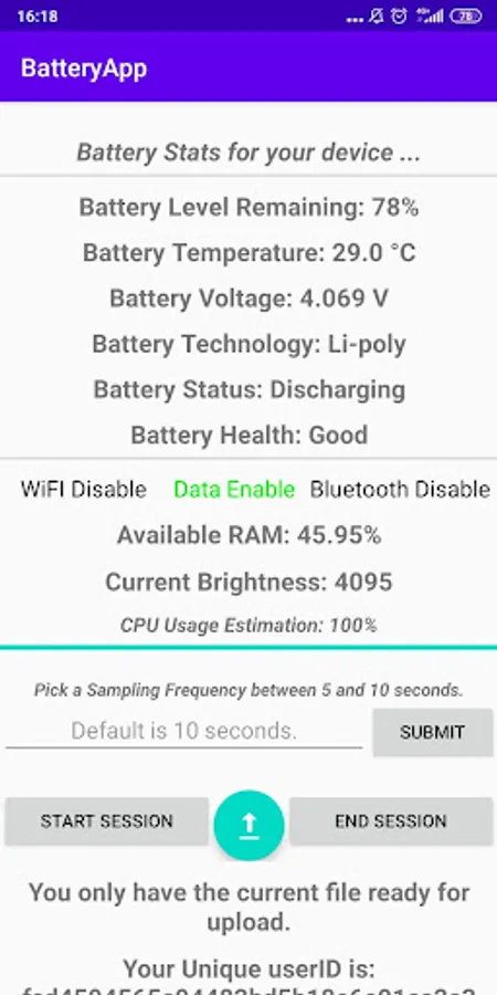 BatteryApp does not work in the background, it collects data only when you activate it and there will be a notification in the Notification Shade the whole time you are using the app. To start a usage Session, open BatteryApp (e.g before you open YouTube or Instagram) and press the START SESSION button, with which BatteryApp will be minimized and data collection will begin. If you check your Notification Shade you should see a notification. To end the usage Session, return to BatteryApp and press the END SESSION button. The usage Sessions do not have to be long in duration, however, in the context of my Thesis, where the use of the battery is the main thing analyzed, the battery level must drop by at least 1% in each session in order to be of a greater value in the analysis. Finally, use the Upload Button to upload the files; uploading is not required after each use, as the Sessions are stored on the mobile and will be deleted after a successful upload.