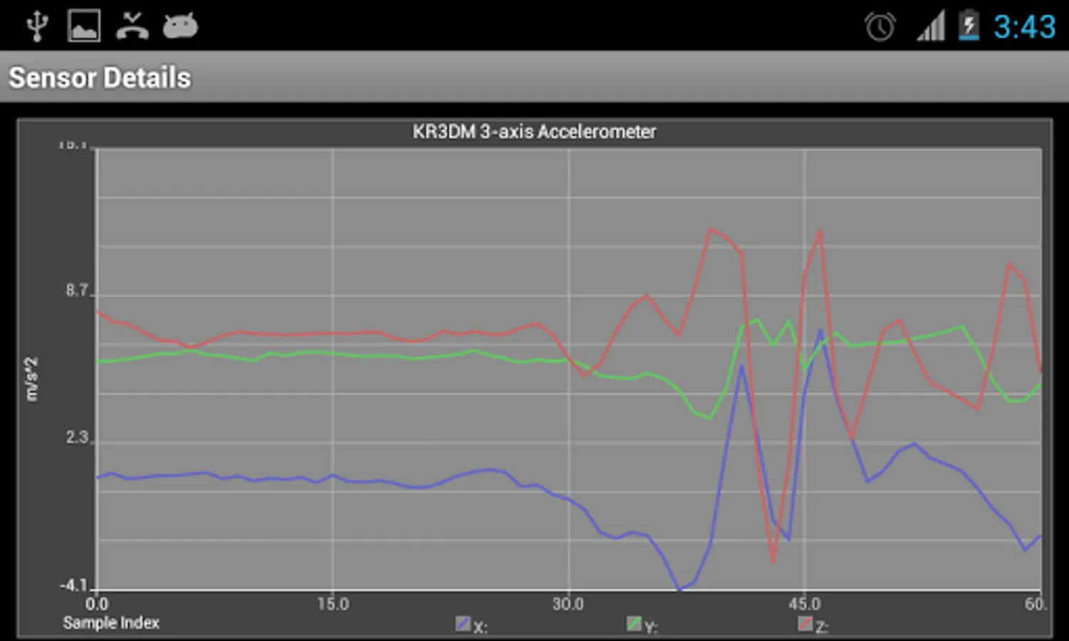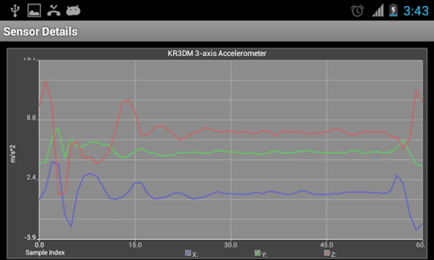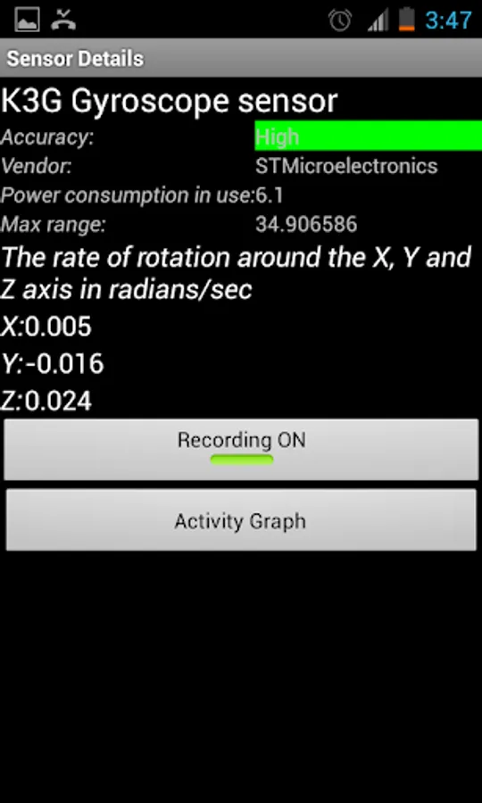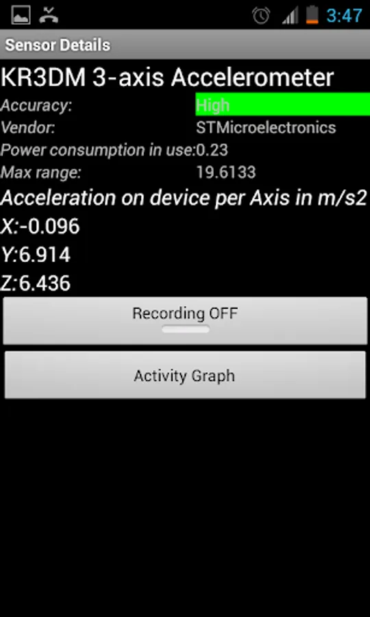 Sensor readings are provided unfiltered along with the sensor name reported accuracy, vendor and power consumption.