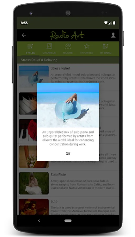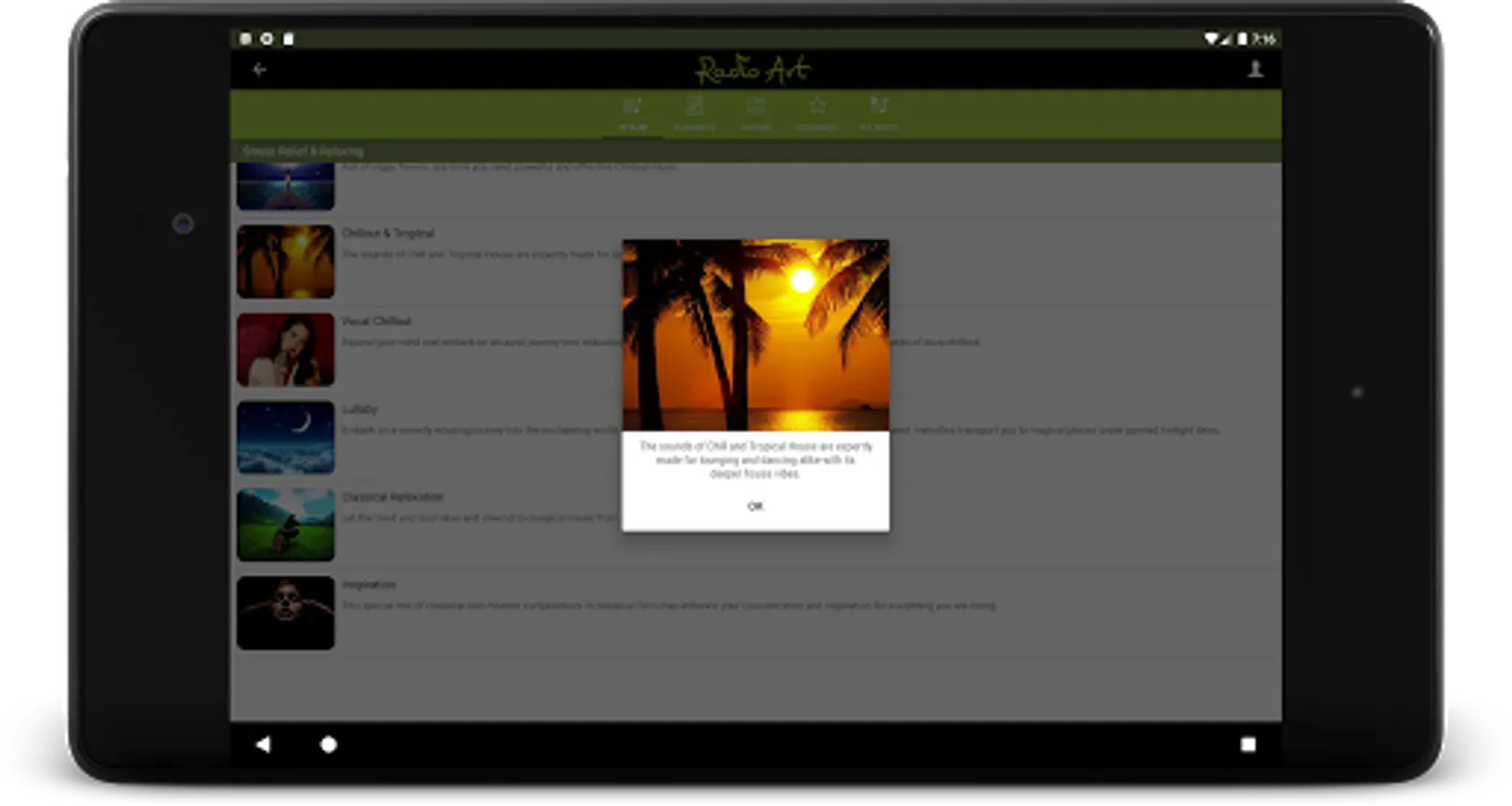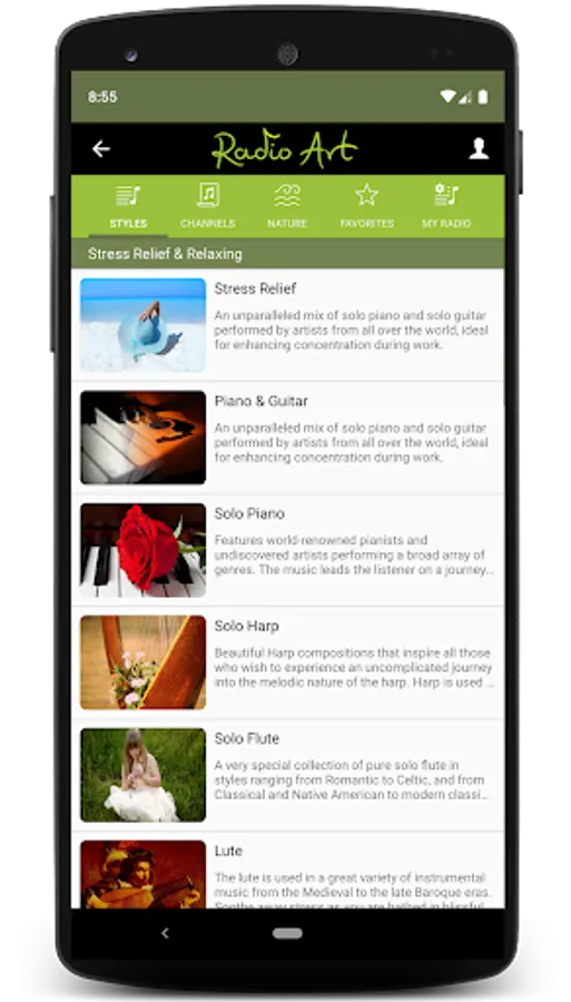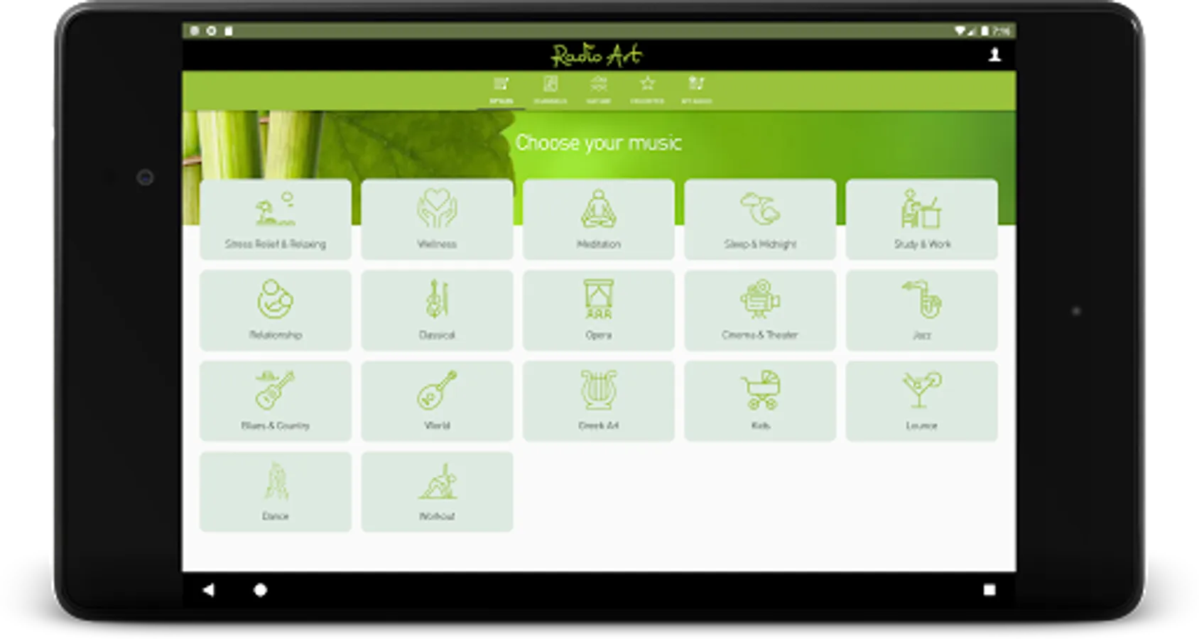 Radio Art offers many music channels including Stress Relief, Relaxing, Meditation, Sleep, Yoga, Spa, Chillout, Solo Piano, Harp, Flute, Classical, Classical Composers, Jazz, Fusion, Movies, Theatrical, Blues, Ethnic, Workout and many others.