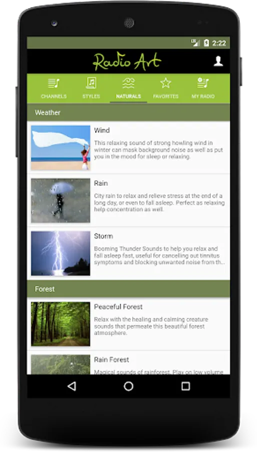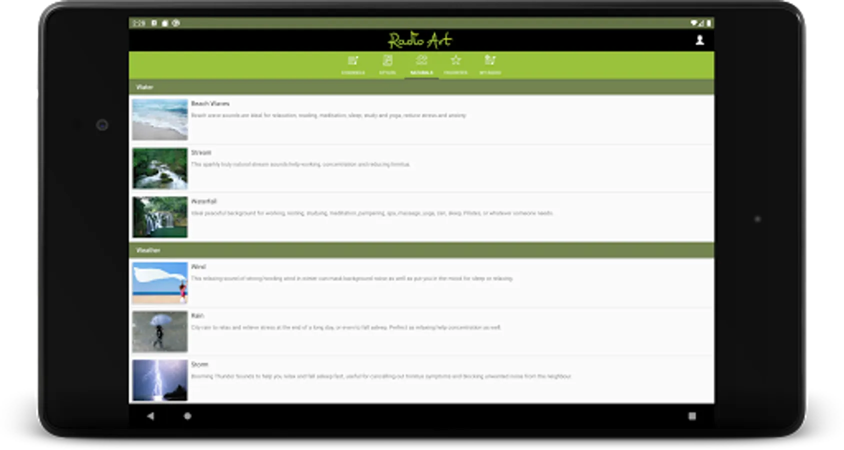 Radio Art offers for subscribers only, many channels with Nature sounds such as Water, Weather, Forest, Birds, Mammals, Creatures, Atmospheres & Noise Sounds of high relaxing effects, recorded at their original soundscapes