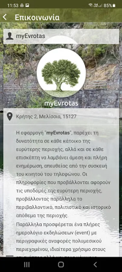 The application "myEvrotas", provides the possibility to every resident of the wider area, but also to every visitor to receive immediate and complete information, directly from the mobile phone device. The information displayed concerns the infrastructure of the wider area, while highlighting the environmental, cultural and historical stock of the area.