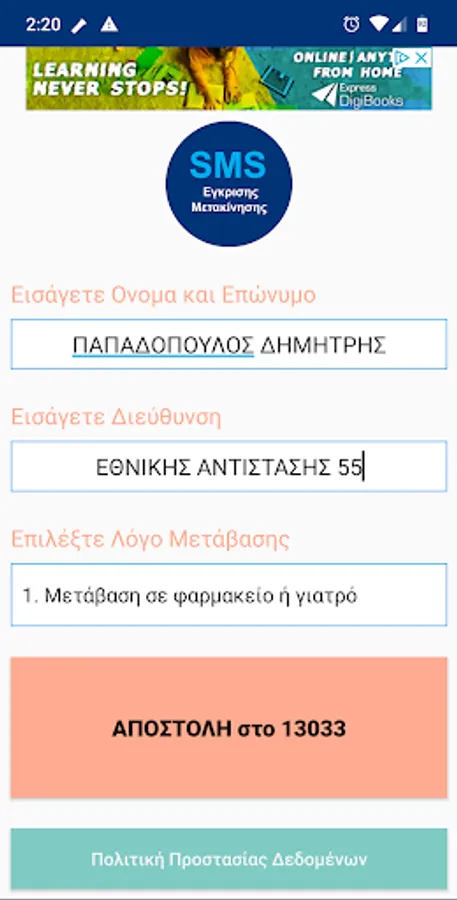 Your name and address information is stored locally on your mobile phone. More information on data protection policy is provided at the link below.
