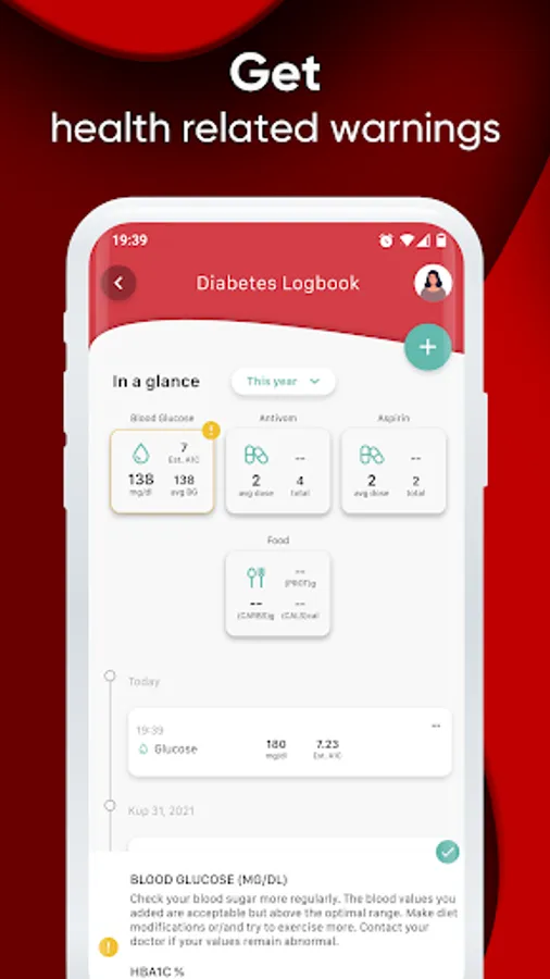The user can add his daily diabetes-related measurements, such as blood glucose, medications, e.g. metformin or insulin (bolus & basal), diet, weight, exercise/activity, mood, blood pressure, cholesterol levels, HbA1C value and more.