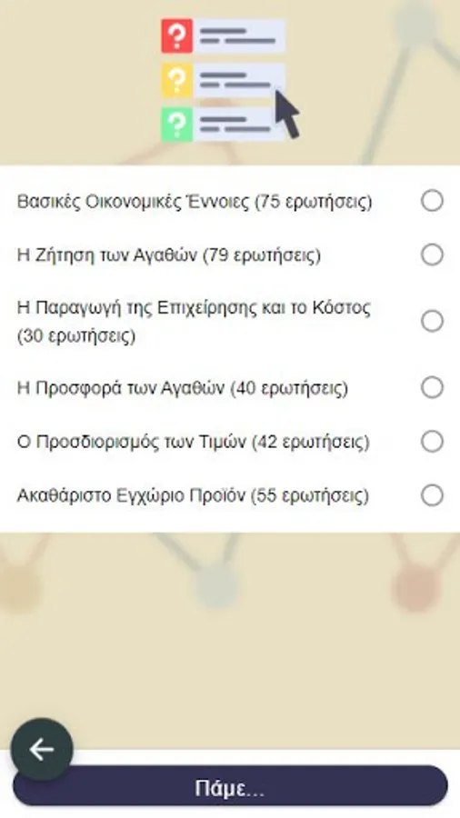 A pleasant aid for those who teach the course of the principles of economic theory (AOT) in the Panhellenic for the year 2021. Learn by playing and win medals for your achievements! See how you do in relation to the best and try again and again! Win all the medals and maybe you will be the lucky one to win the prize after the Panhellenic Games!