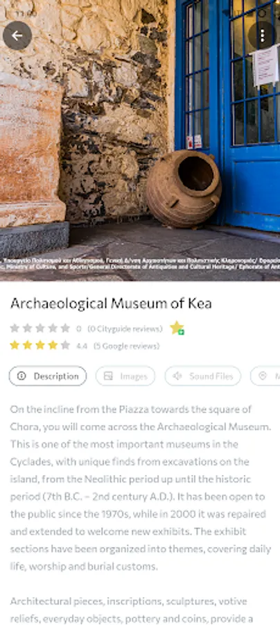 As part of the project a Mobile application for iOS and Android was developed, which includes the cultural digital guide of Kea in three languages (Greek, English, German). The application provides information for the most important monuments and museums located in the Municipality, for the annual events as well as the cultural events of the island , gives the possibility of remote access to valuable audiovisual cultural material and online booking of tickets for cultural events of the Municipality.