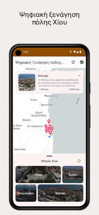 The app is a digital guide where every visitor starts a tour of the city center. The tour includes rich informational and photographic material, audio narrations and aerial filming of the center.