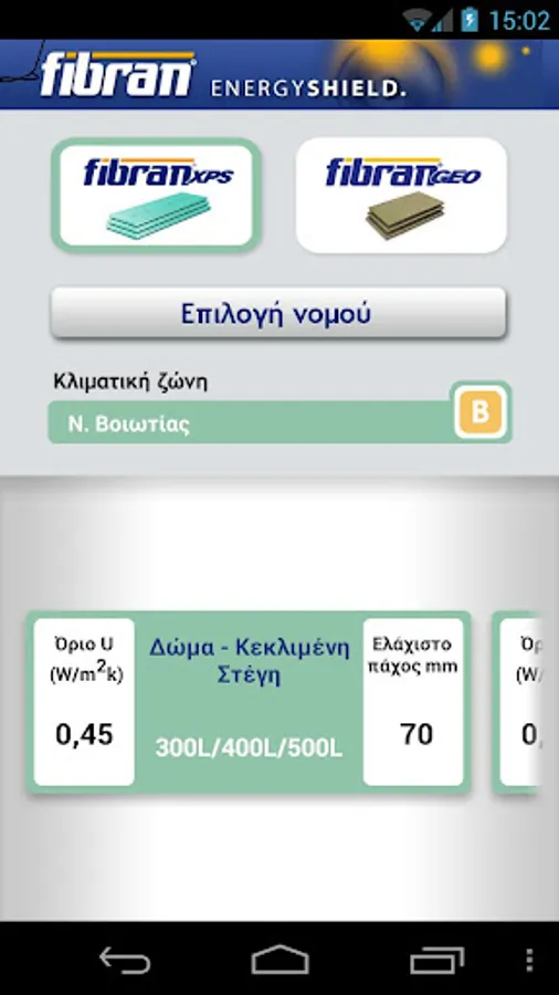 Through the application, the user can calculate the minimum insulation thickness for all construction solutions Fibran for 4 thermal zones of Greece under K.En.A.K.