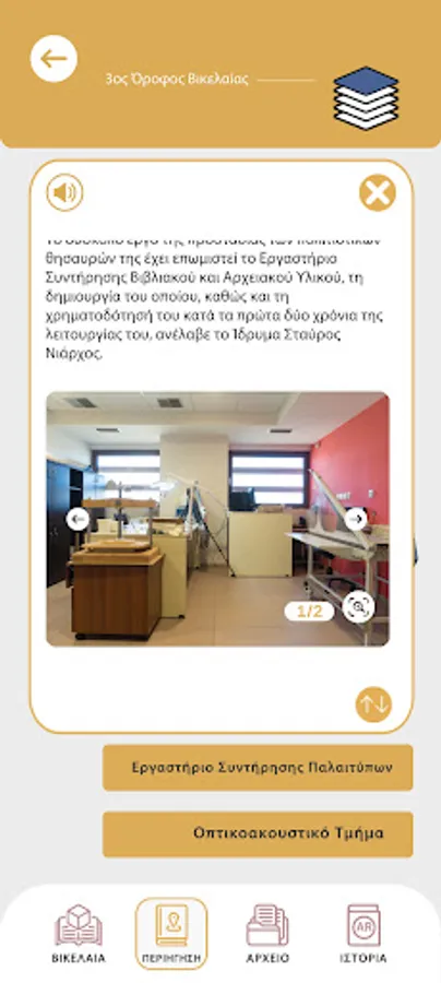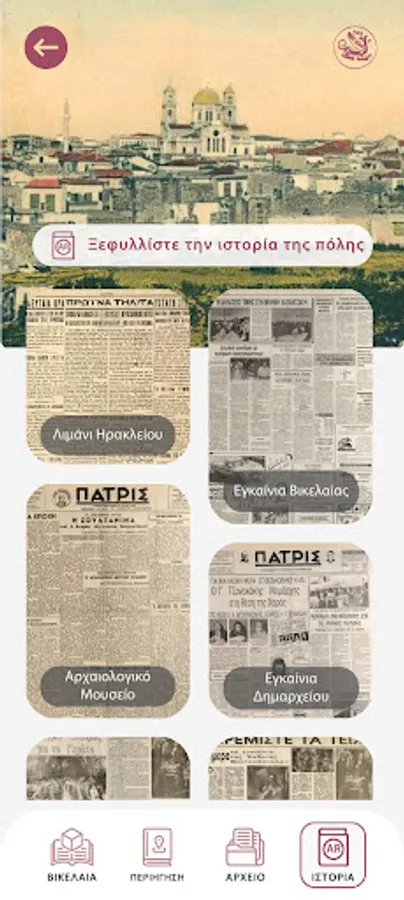 Through the application, the visitor is given the opportunity to browse the sites of Vikelaia and have a first acquaintance with its historical archive and especially with the Archive of newspapers and magazines. The application presents information and other multimedia elements in an innovative way with the technology of augmented reality.